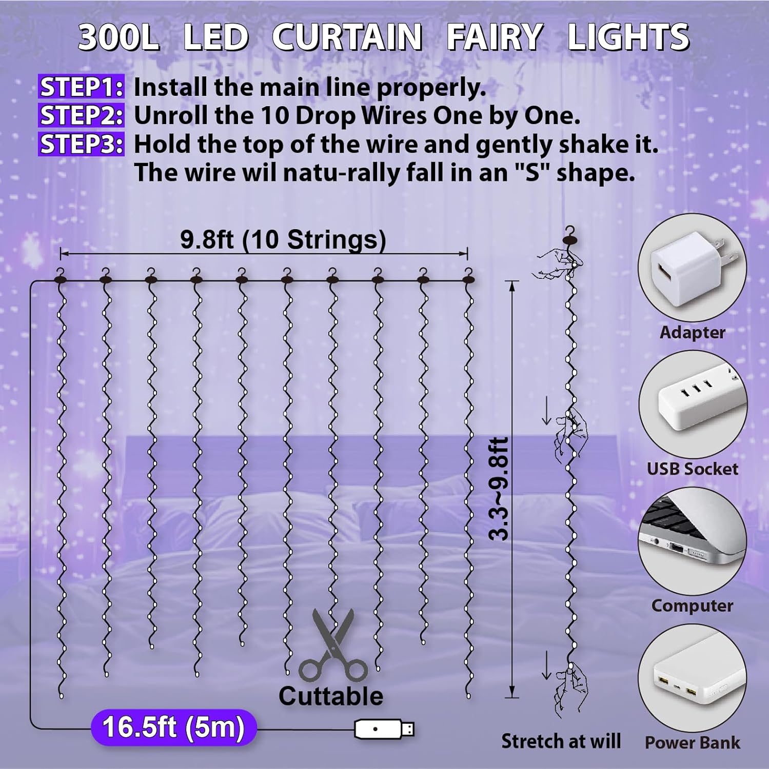 • 16.5 Ft Lead Wire: 300 individual LEDs, 9.8ft.x9.8ft curtains lights come with extra 16.5ft long power cord; 9.8ft main strand and 10 drop strings included hooks; Copper wire drop strings is tough and flexible, hanging and adjustable desired height naturally easily; No limits to your imagination, Do the shape you like; Enjoy a fairytale world (Curtain is NOT included)