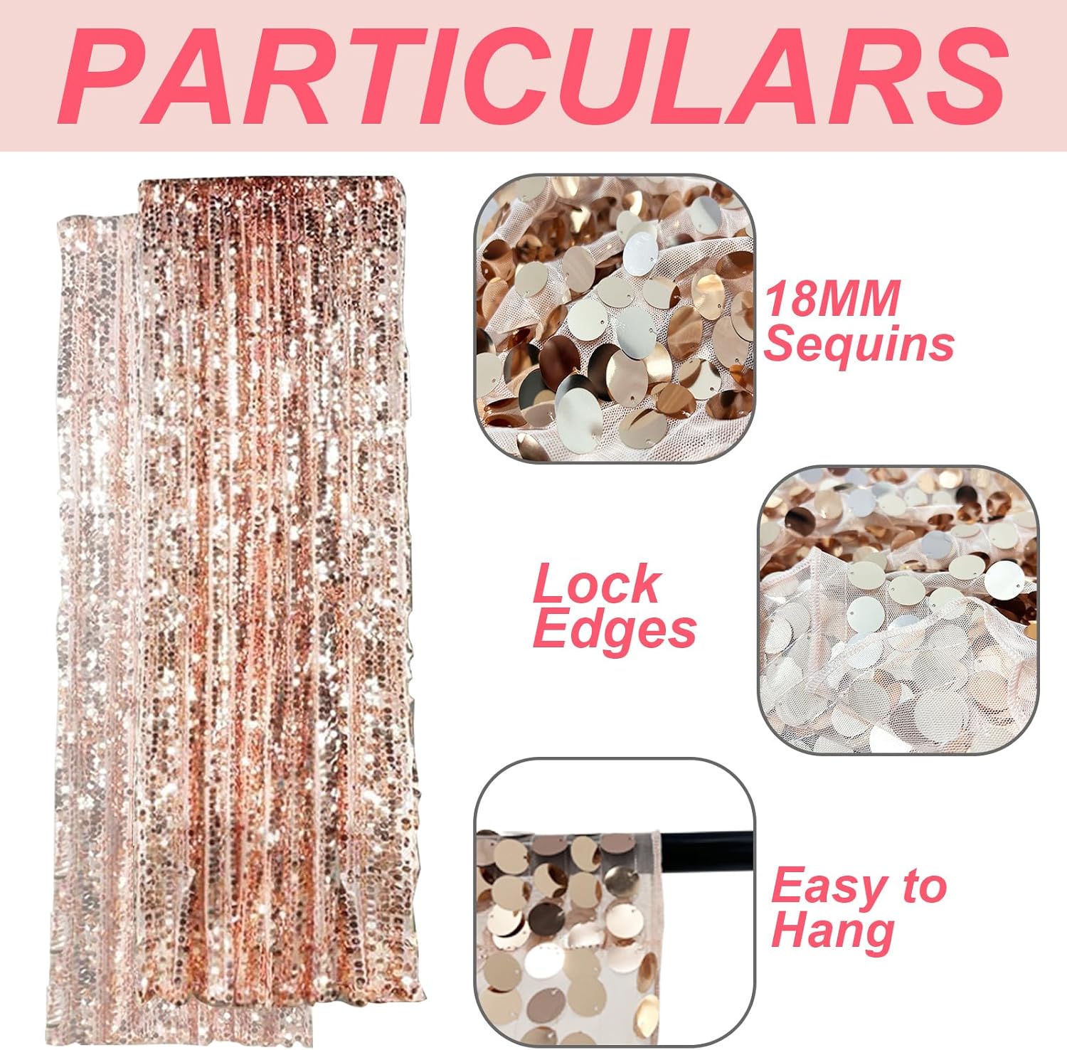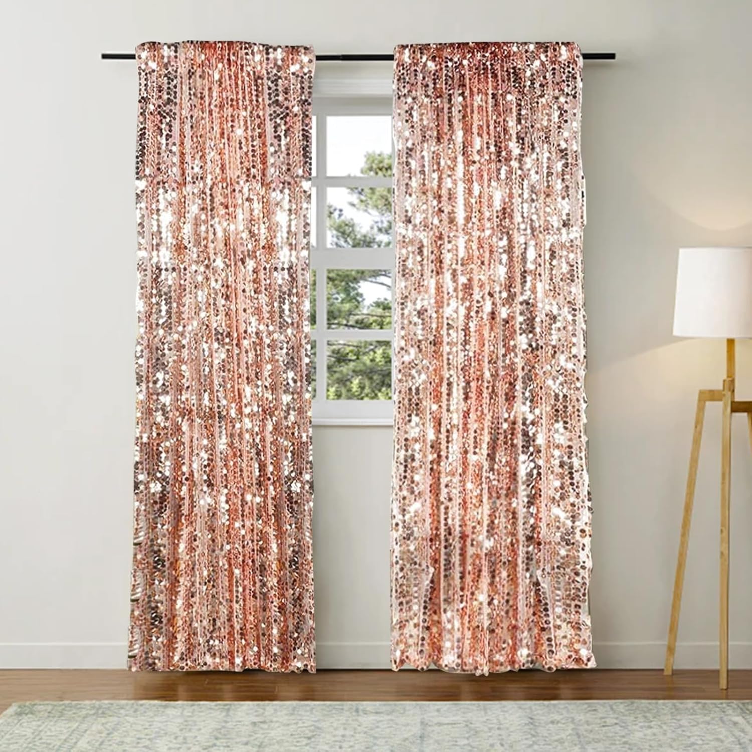 • Sequin Backdrop Curtain Panels: Your package will include 2 sequin photography backdrop curtains. Each rose gold background panel is 4.5FT wide and 9FT high, the whole payette sequin curtain measures 9FT x 9FT.