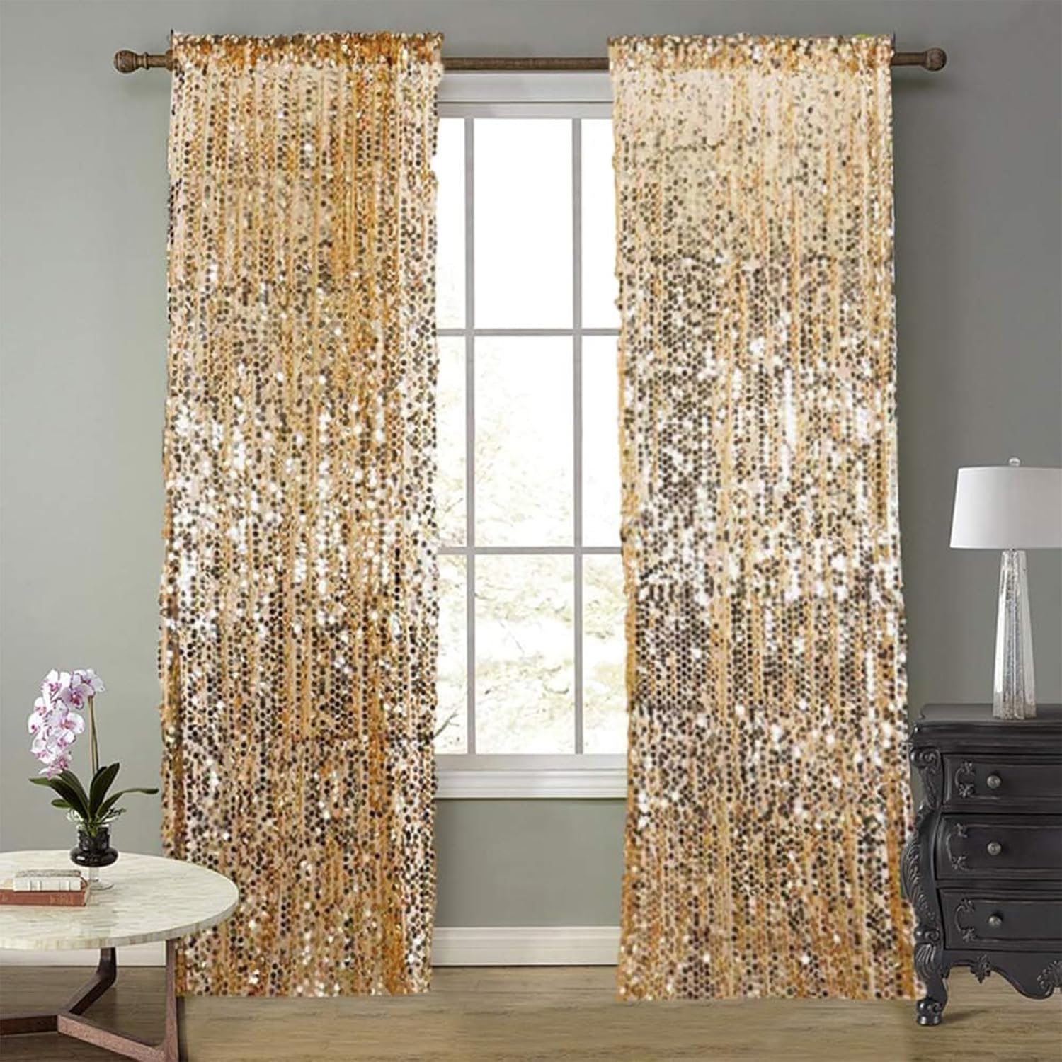 • Wide Use: Gold sequin backdrop curtains are perfect for birthdays, weddings, graduations, Christmas, Valentine's Day, portraits, photo booths, holiday decorations, home decorations and many other parties. If you have any questions, you can find us through Amazon and we will try our best to help you solve the questions!