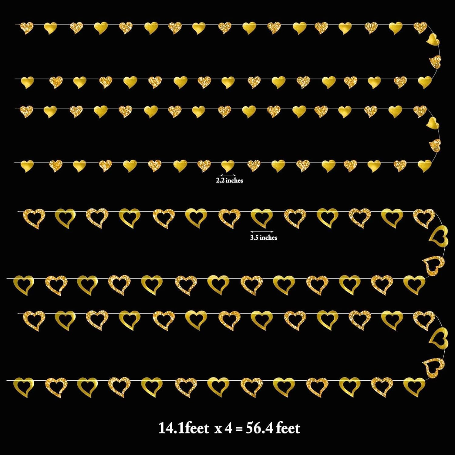 • Package: 2 sets of glitter gold heart garlands in two designs—smaller solid hearts (2 x 2.2 inches) and larger hollow hearts (3.2 x 3.5 inches). Each set includes two 14.1-foot-long garlands, totaling 56.4 feet in length. Made with shining cardstock and sewn with gold thread, these valentines day garlands add charm to any setting, from romantic events to everyday heart decorations.
