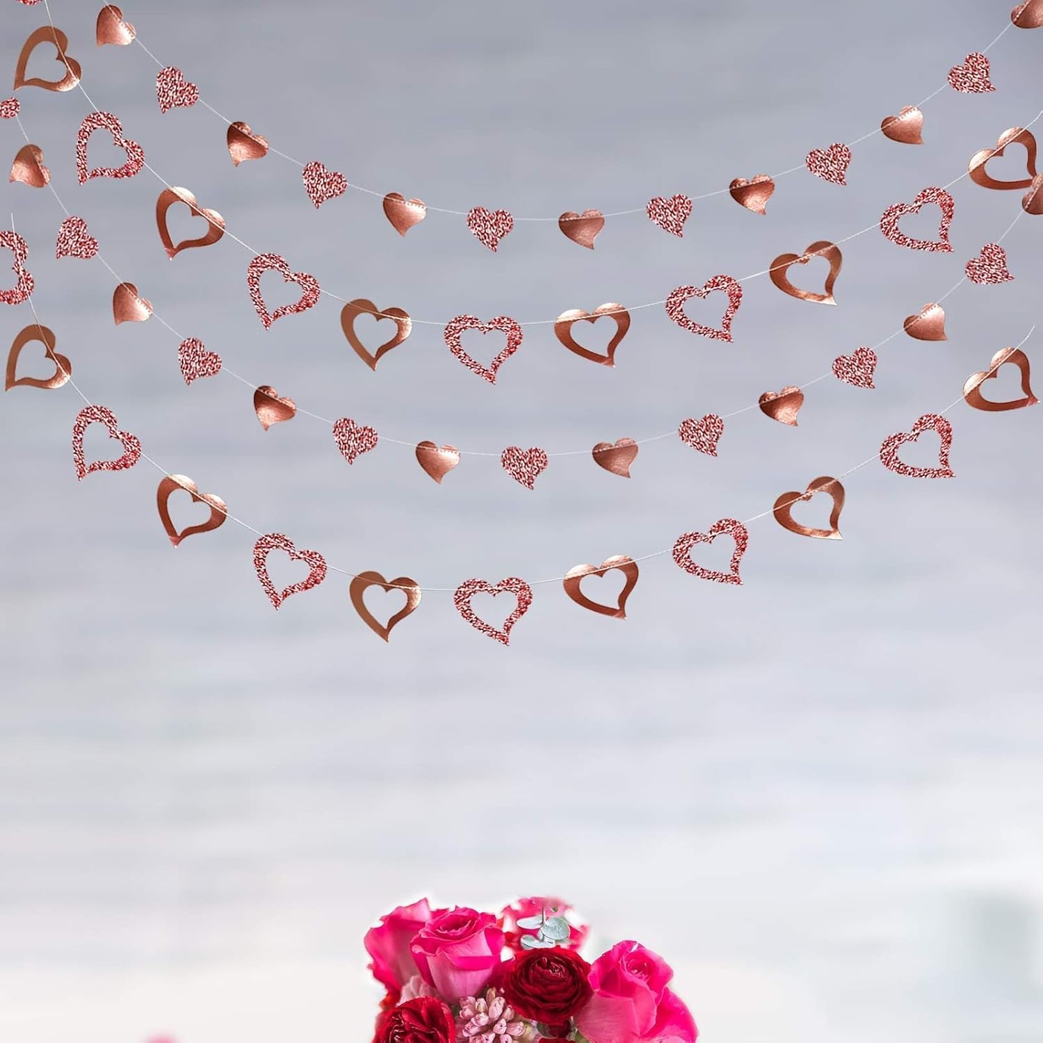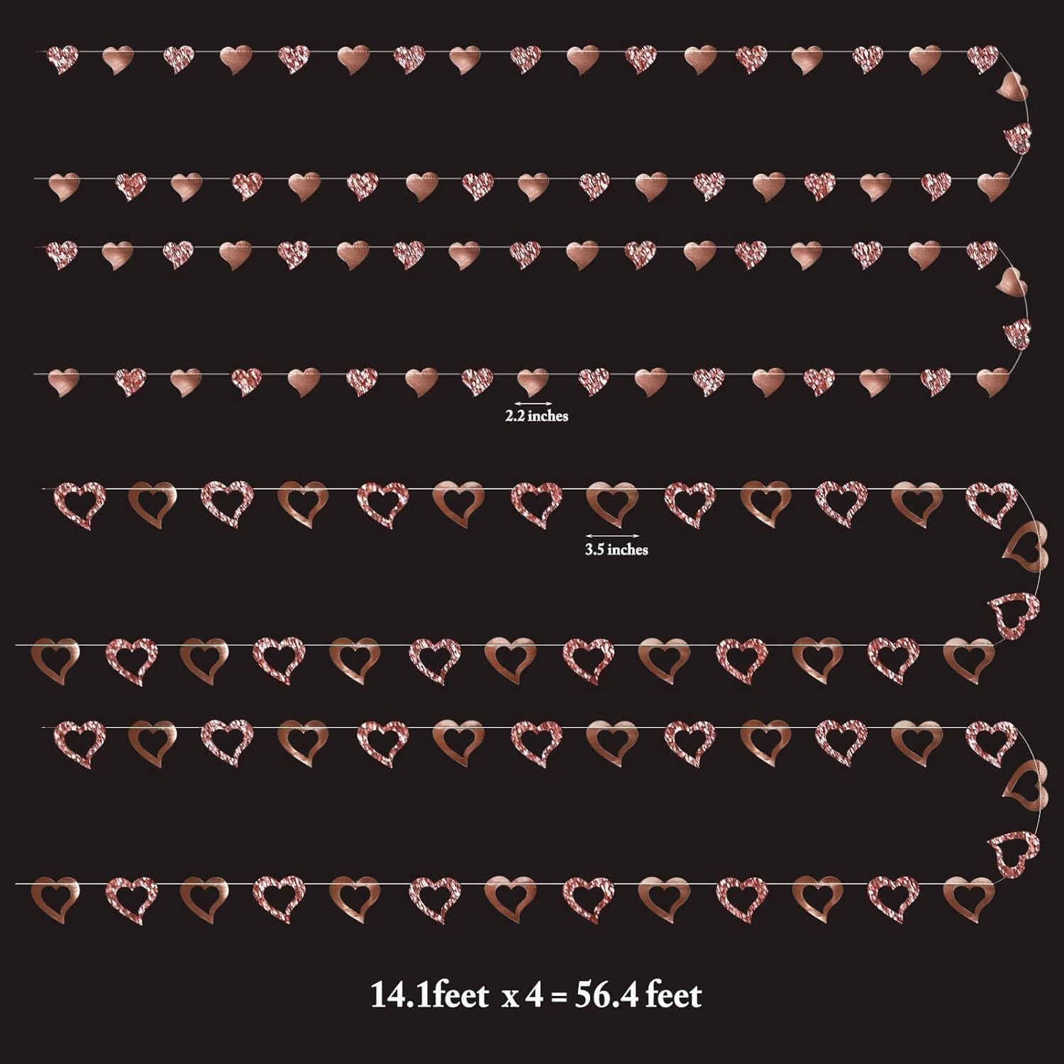 • Package Includes : 4 strings of 14 ft rose gold heart garlands, 2 strings are solid hearts of 2 x 2.2 inches and 2 are hollow-out hearts of 3.2 x 3.5 inches sewn together. Totally 56 ft. The hearts are made of glittering and shining paper.