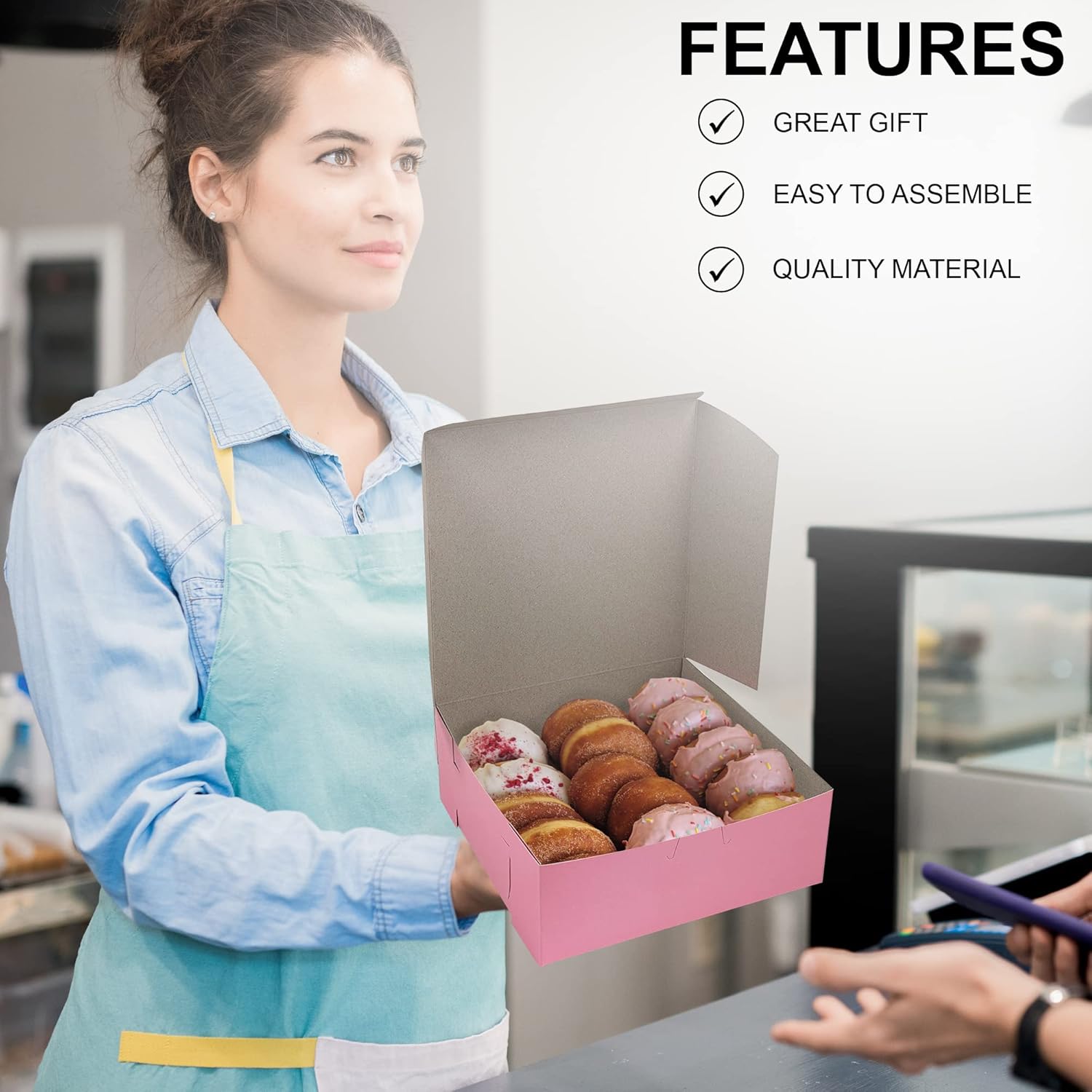 • The box: These pretty pink cookie boxes are perfect for keeping all your delicious mini baked goods safe while on the go. With a size of 8" Length x 8" Width x 3" these dessert boxes are a great box for storing freshly baked donuts, mini cakes, pies, cupcakes, muffins, cookies, chocolate covered fruit, and bagels and keeping them away from the mess and from getting dirty.