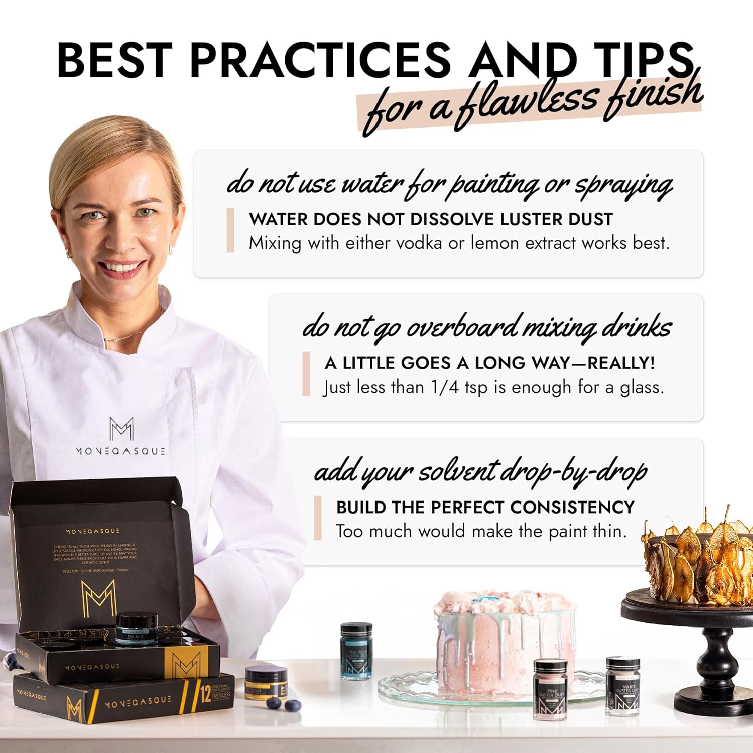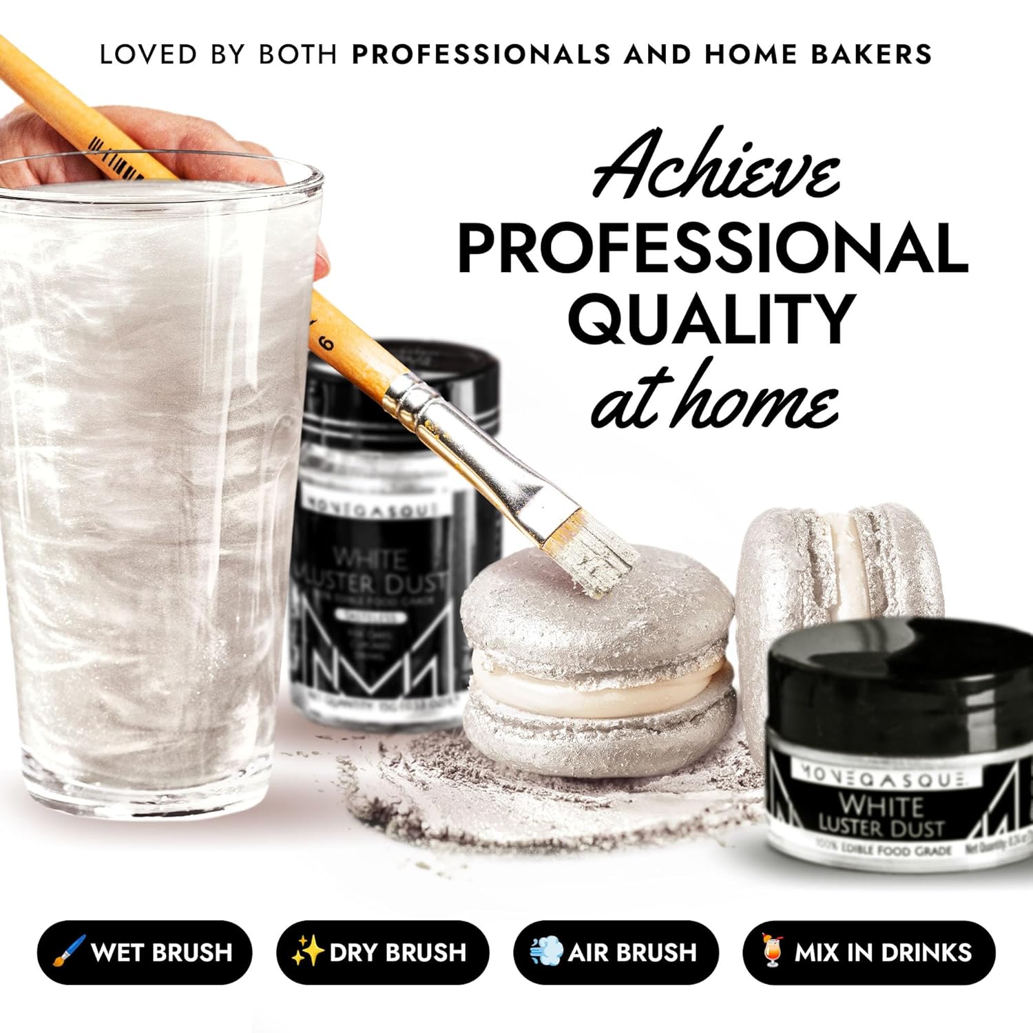 • EASY TO USE: Our white luster dust is incredibly versatile. Apply with a wet brush, airbrush, or dry brush, and even mix into beverages. Achieve professional-looking results effortlessly at home, whether decorating halloween cakes or adding shimmer to cocktails.