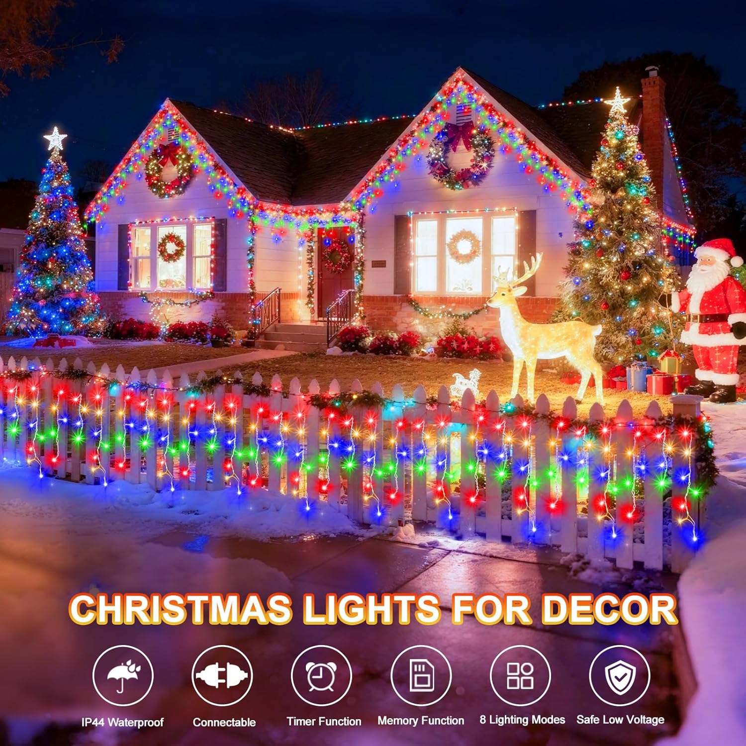 • 1 Steady On +7 Lighting Modes: Stay away from single lighting mode! Switched the 8 lighting modes by pressing the button on the Plug (Combination/In Waves/Sequential/Slo-Glo/Chasing/Slow Fade/Flash/Steady On). When you are hosting a lively Christmas gathering, variable Lighting Modes allows you to set the perfect mood for any occasion. Take your Christmas party to the next level with these professional Christmas string lights, and get more compliments from your neighbors.