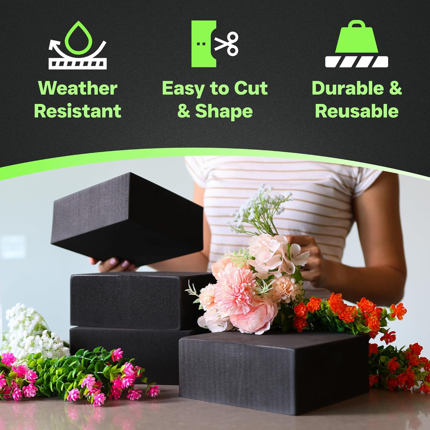 XCEL Floral Foam Blocks - Reusable, Weather Resistant Foam - Perfect for Fresh & Artificial Flower Arrangements, Crafts, Planter Boxes, Home Decor & More - 4-Pk, Black (7” x 7” x 3”)