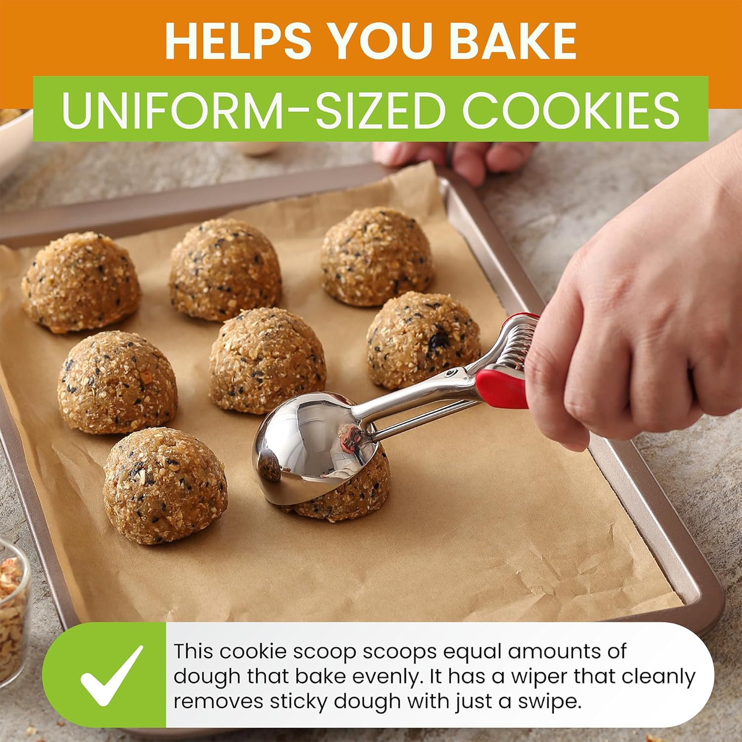 • Easy to Use - Using this cookie scooper for baking allows you to scoop effortlessly. It releases your cookie dough with a simple squeeze of the trigger, so you can make “store-bought-quality” cookies right at home. The metal cookie scoop is Dishwasher Safe making cleanup a breeze.