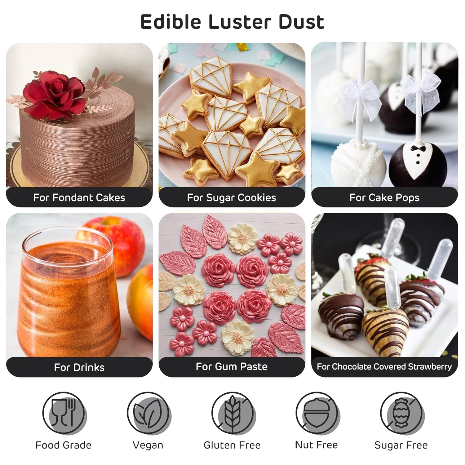 • WIDELY USED FOR BAKING -- The luster dusts is ideal for decorating fondant, gumpaste, royal icing cookies, buttercream, chocolate, candy apple, macaroons, cakes and so on; You can also create shimmery cocktails, champagne or any drink by adding a little edible luster to your beverage, have some fun