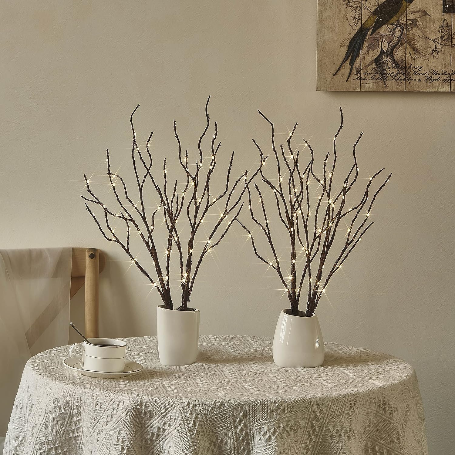 • 【LIFELIKE IN APPEARANCE】: Hand painted with realistic natural brown bark-inspired finish on the twig lights. IP44 waterproof and 2pcs ground stakes included for taller vase use or outdoor patio, porch, birthday party, wedding or events celebrations decor