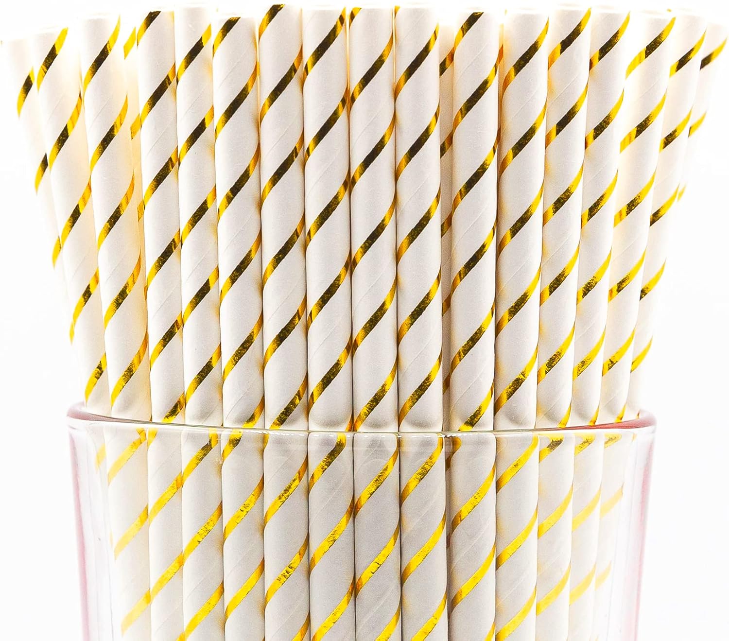 Pack of 900 Gold Foil Stripes Biodegradable 4-Ply Paper Drinking Straws (Compostable, Non-toxic, BPA-free)