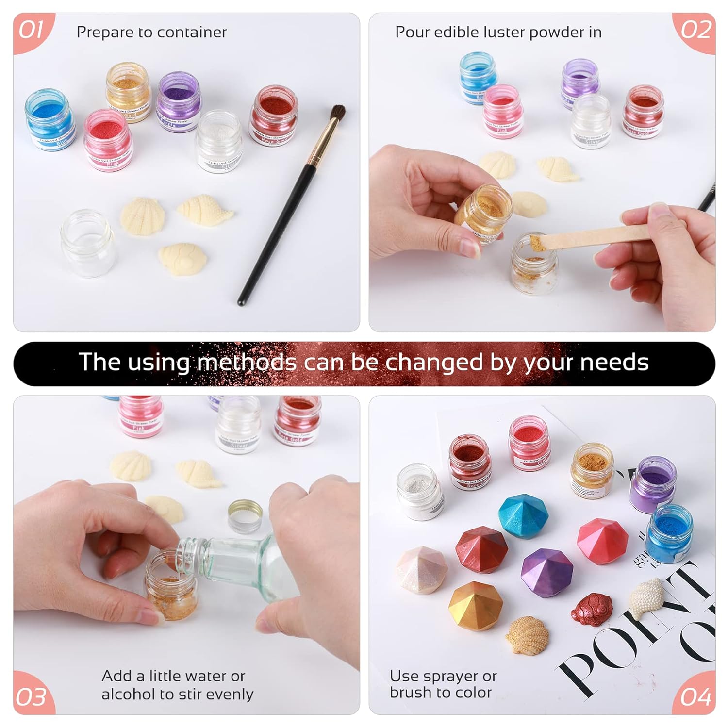 • 【Easy to Use】Luster powder dust can be dry brushed or mixed with vodka, grain alcohol, or oil-based flavorings to use a spray gun for smoothing, for your cake or sugar art to add luxury luster effects