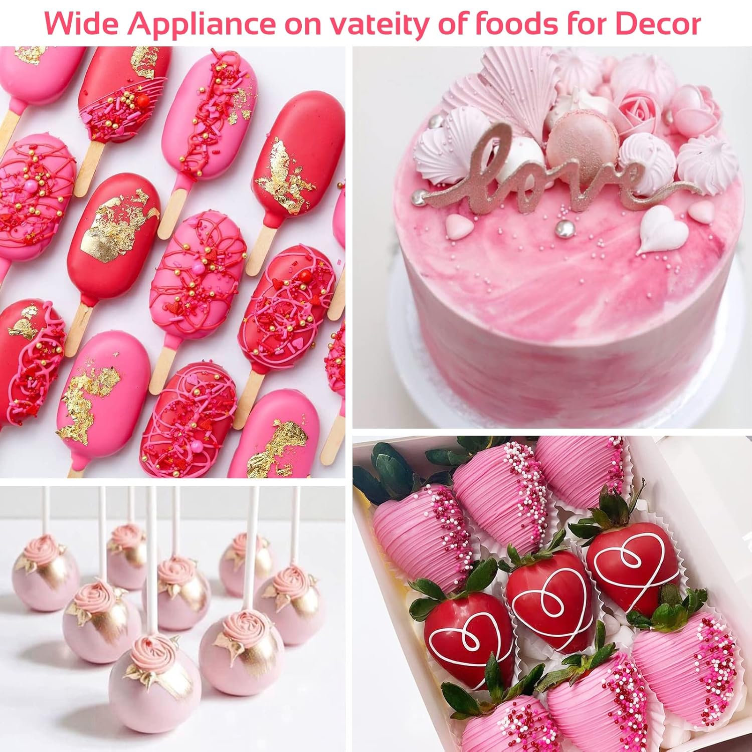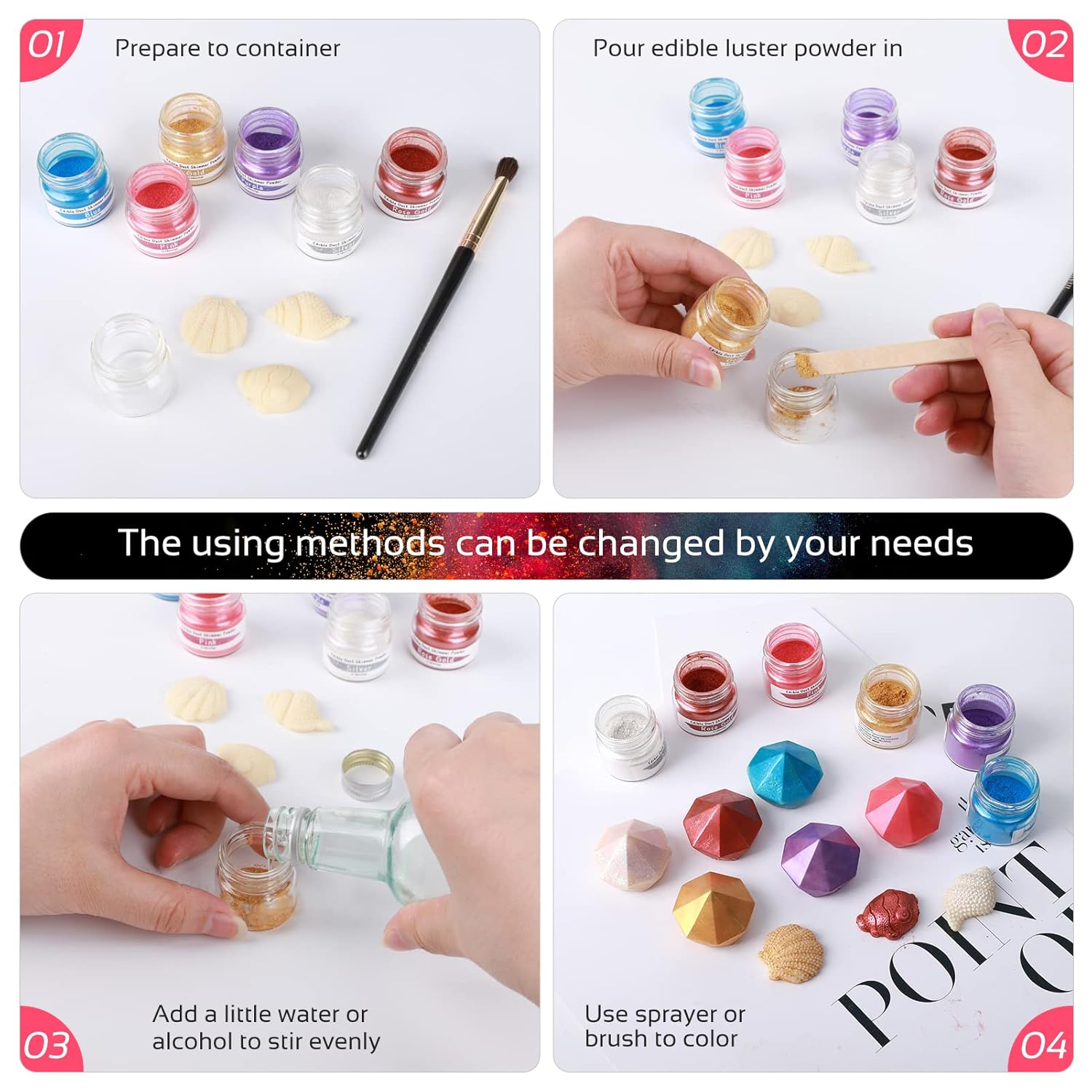 • 【Widely Used】Food-grade glossy cake decoration dust, shimmer luster powder edible glitter for cakes is very suitable for paint, chewing gum paste or fondant fudge, metal finish, fudge/chewing gum, chocolate, pull candy/isomaltose, drinks, etc.,