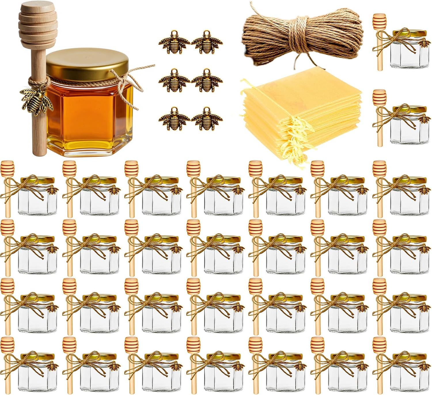 Adabocute Honey Pot, Mini Glass Honey Jars with Wood Dipper, Gold Lid, Bee Charms, Gold Organza Bags, Thank-you Tags, Ideal for Baby Showers Wedding Favors Party Favors, 2oz 30 Pack