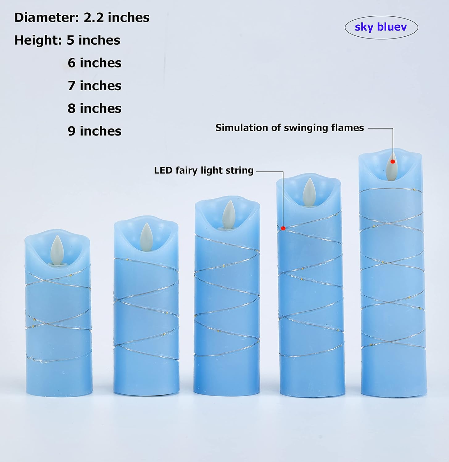 danip LED Flameless Candle with Embedded Star String, 5 Piece LED Candle with 10 Button Remote Control, 24 Hours Timer Function, Dancing Flame, Real Wax, Battery Powered. (Sky Blue)