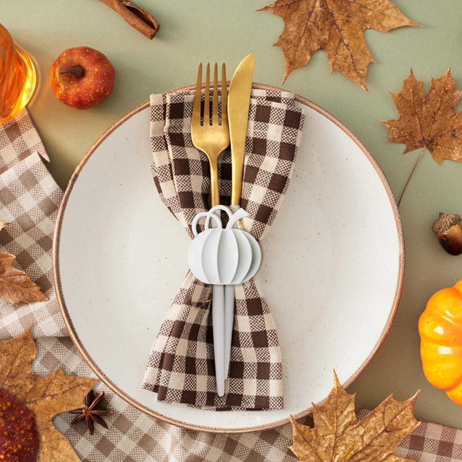 • 🎃🍁【VINTAGE PUMPKIN】Realistic harvest white pumpkin design, looks simple and beautiful, connected with ring tightly and not fall off, really added a delicate to your table, bring lots of fun to your dinner time, and impress every guest deeply at your dinner party.