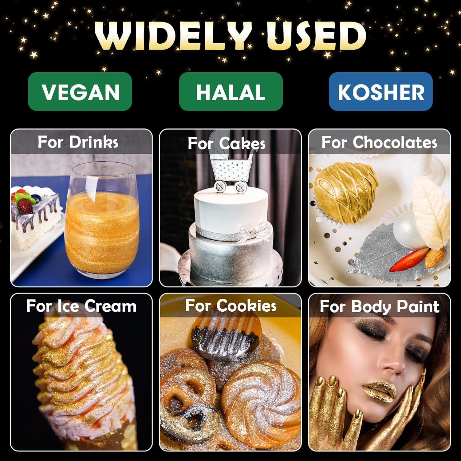• ✔️【Vegan & Allergen-Free】Food-grade glitter uses only the highest quality vegan ingredients and does not contain common food allergens, including gluten, nuts or dairy products, so everyone can use and enjoy this product regardless of diet or food allergies. Unlike food contact glitter, these are 100% edible, so you don't need to worry about using them in your creations to make them sparkle for all.