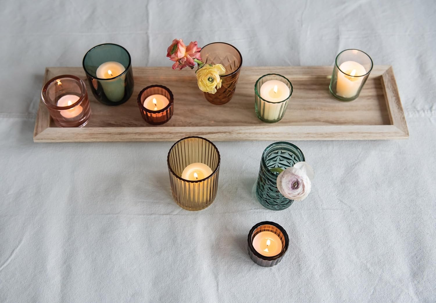 • A set of 9 glass votive holders of varying sizes, shapes, and hues of green and brown on a solid wood tray