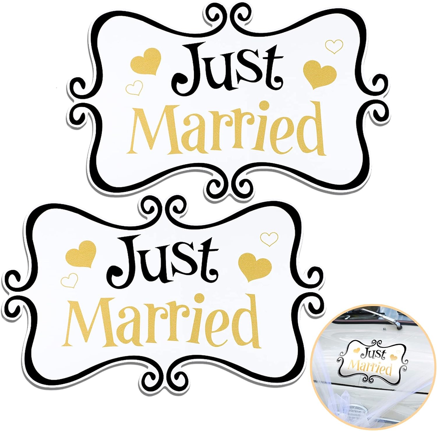 • Beautiful appearance: the color of the delicate wedding car decal include black and gold, and the decal comes with words [just married], there are laces and heart-shaped patterns around the words, which can create a romantic atmosphere for your wedding car decoration