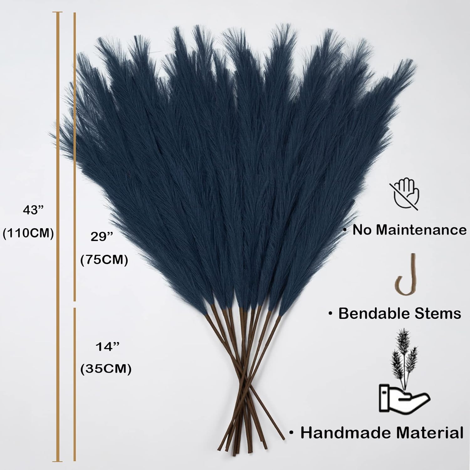 • High End Looking Faux Pampas Grass: It's actually made of a metal wire in the stem and silk feather, it holds shape very well. The large pampas grass is really soft and feather like, 15 branches on each stem and the heads of each stem is designed you can fluff them up for a fuller look, provide a chic bohemian modern display