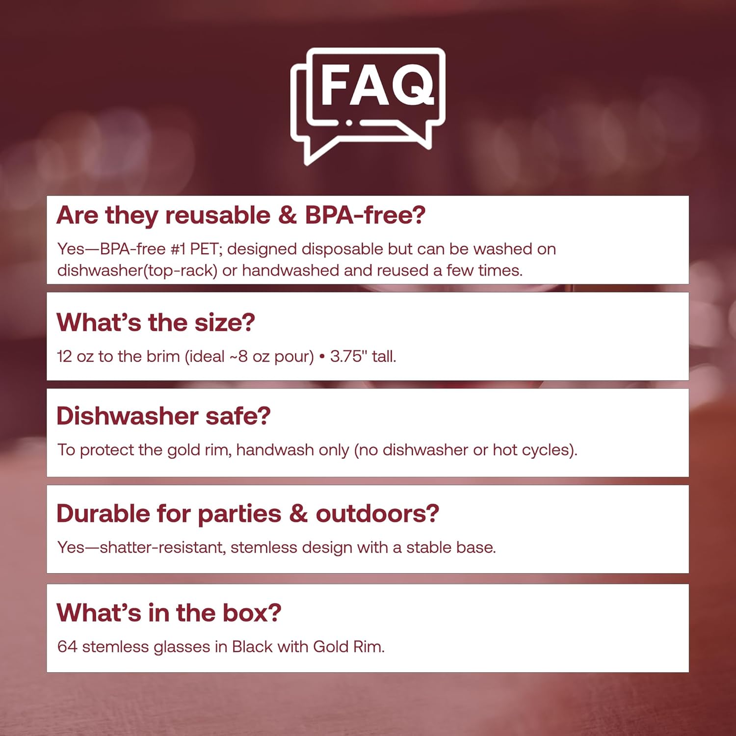 • ELEGANT BLACK & GOLD STEMLESS DESIGN – Make a statement with these stylish 12 oz stemless wine glasses featuring a sleek black body and refined gold rim, ideal for elevating any event’s aesthetic.