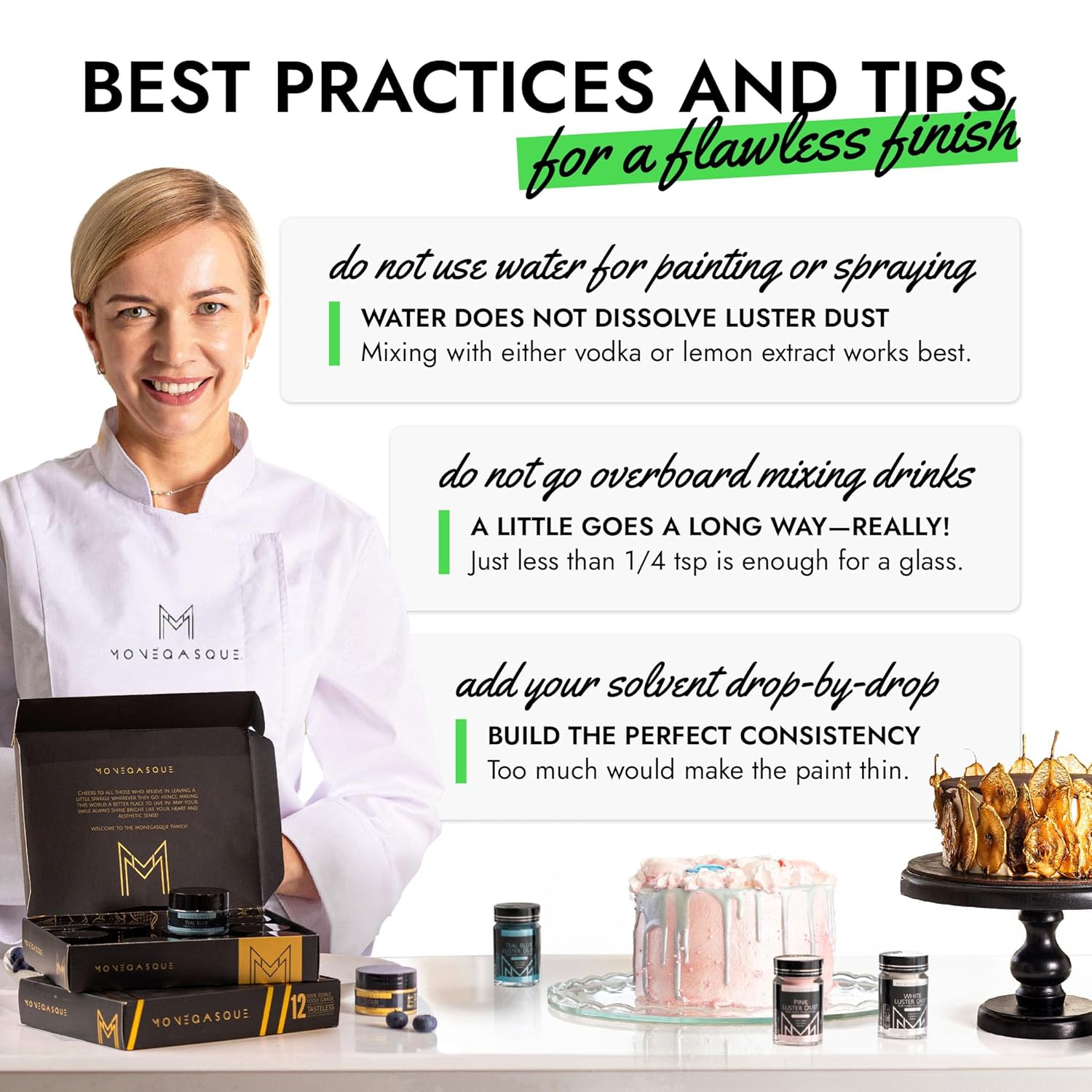 • EASY TO USE: Our green luster dust is incredibly versatile. Apply with a wet brush, airbrush, or dry brush, and even mix into beverages. Achieve professional-looking results effortlessly at home, whether decorating halloween cakes or adding shimmer to cocktails.