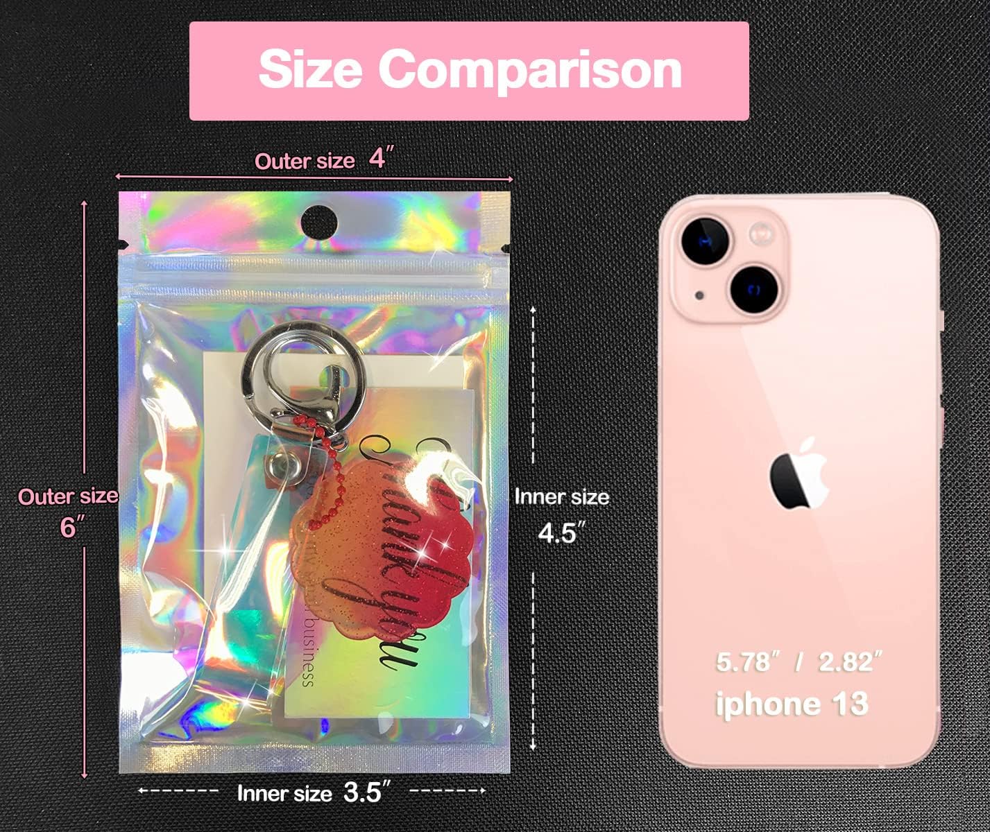 • Attention for Size - Please make sure you choose the RIGHT size before placing the order. There're photo & description about the size. Please pay attention to inner size of the baggies. You will get totally 100 Pcs 4x6 inches holographic packaging bags.