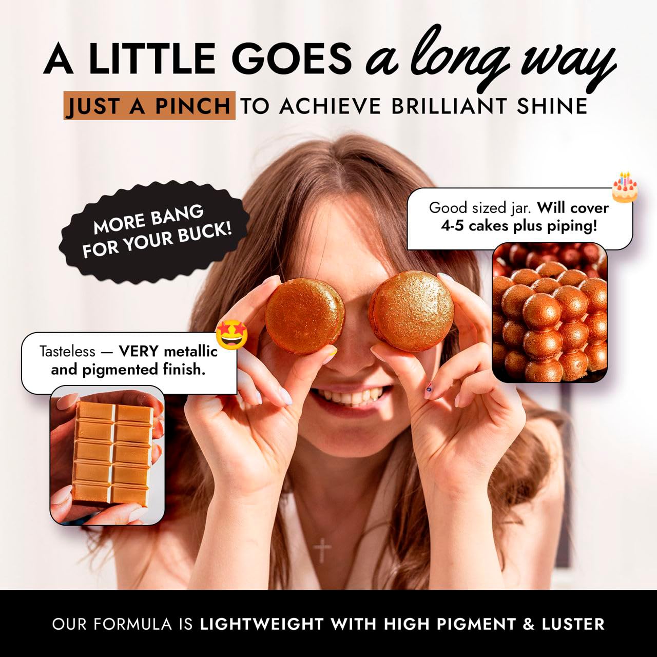 • EASY TO USE: Our bronze luster dust is incredibly versatile. Apply with a wet brush, airbrush, or dry brush, and even mix into beverages. Achieve professional-looking results effortlessly at home, whether decorating halloween cakes or adding shimmer to cocktails.