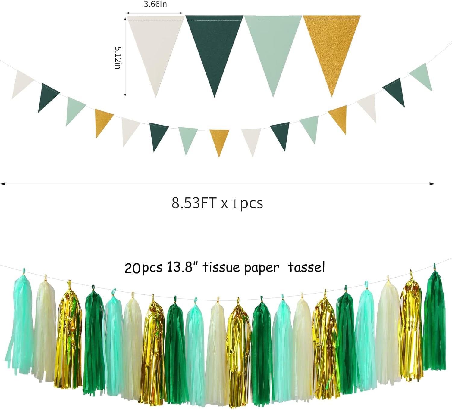 • 【Sage-Green Beige Gold Party Kits】The party decorations kits include 8pcs tissue paper flowers: 4pcs 8" and 4pcs 10" in three color, 1pcs Triangle Flags,1pcs circle dots paper garland, 20pcs tassel garland. Total 30pcs.