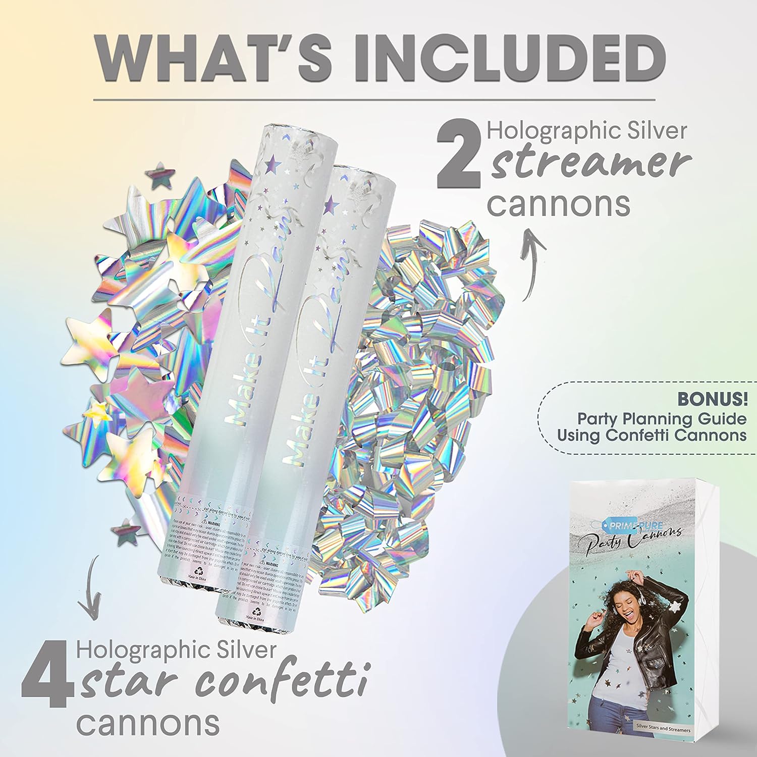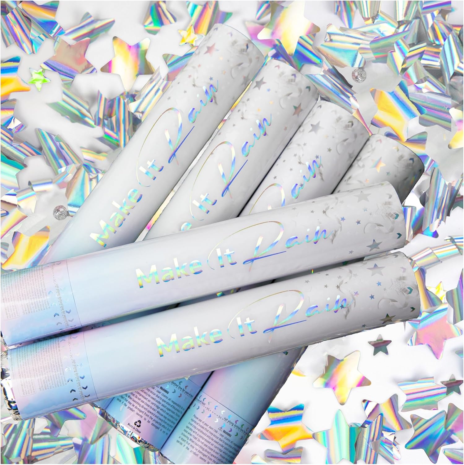 PrimePure Confetti Cannon Party Poppers - Holographic Silver Stars Confetti Popper & Streamer - 6 Pack - Easy-to-Use Party Cannon - Silver Glitter Star Pop Gun for Graduation, Wedding, Birthday, Prank