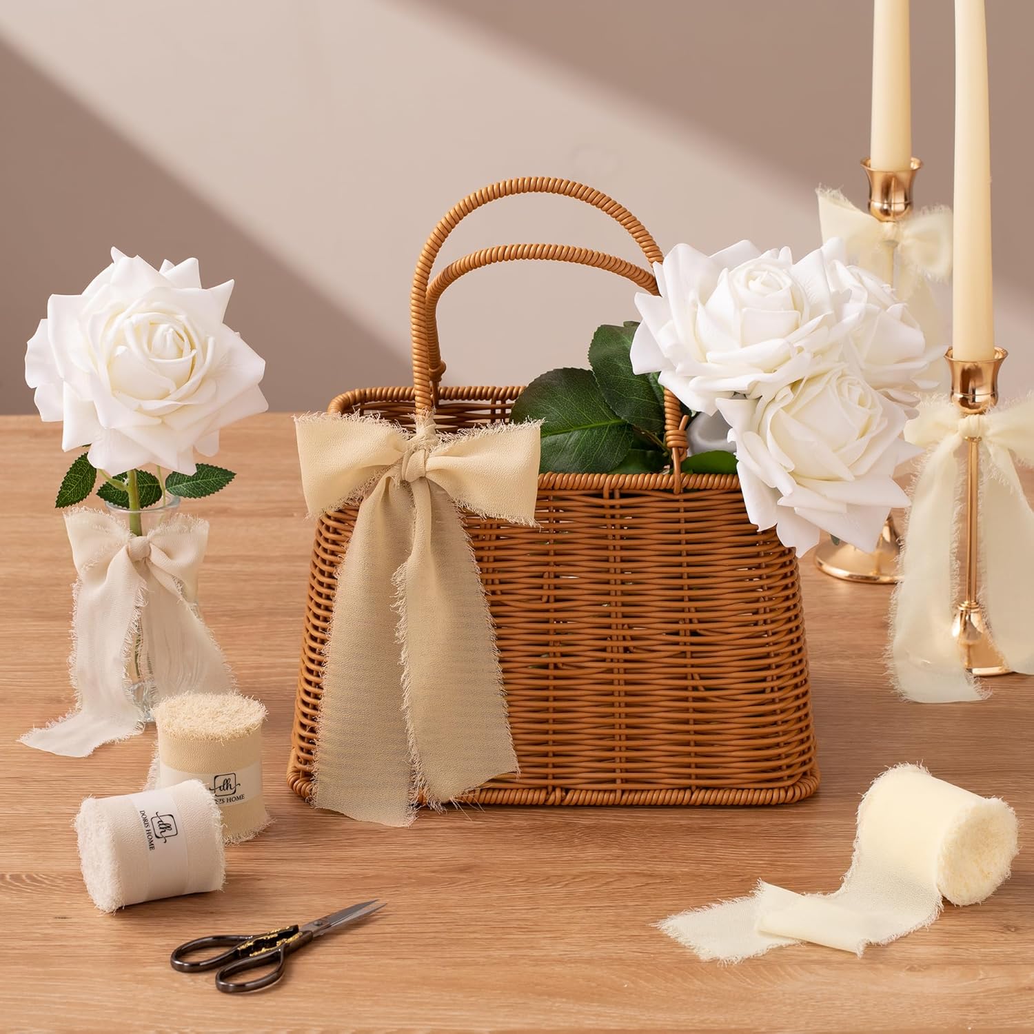 • 【Size and Color】Each roll of chiffon ribbon is 2 inches wide and 7 yards long, perfect for various creative uses such as making bows, decorating wreaths, and DIY crafts. This set includes 3 rolls sand color ribbons. These vibrant frayed ribbons add a rustic charm to your creations, ideal for bouquet wrap or gift ribbon.