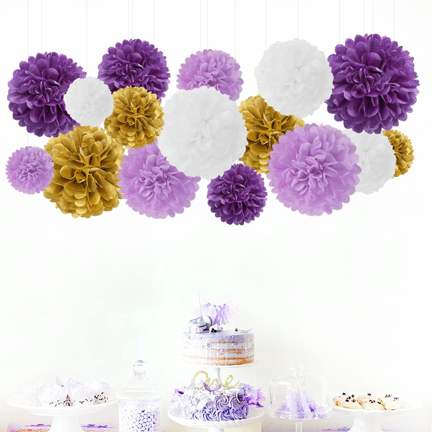 Purple White-Gold Lavender Tissue Pom-Poms - 16pcs Purple Birthday Party Decorations Paper Flowers Garland Wedding Baby Bridal Shower Mothers Graduation Festival Decor Panduola