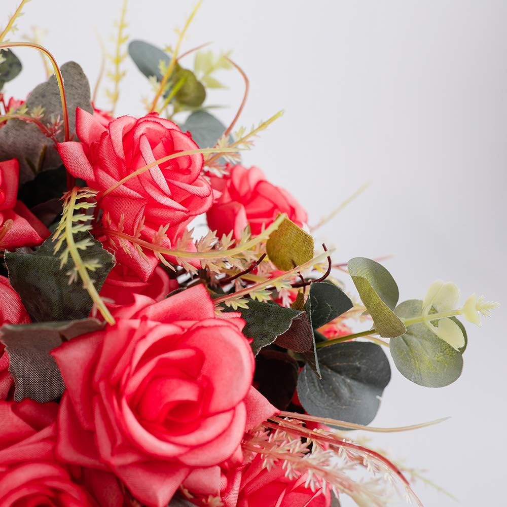 LESING Artificial Rose with Vase,Fake Silk Flowers Bouquets in Vase Table Centerpiece Arrangement for Kitchen Living Room(Red-1)