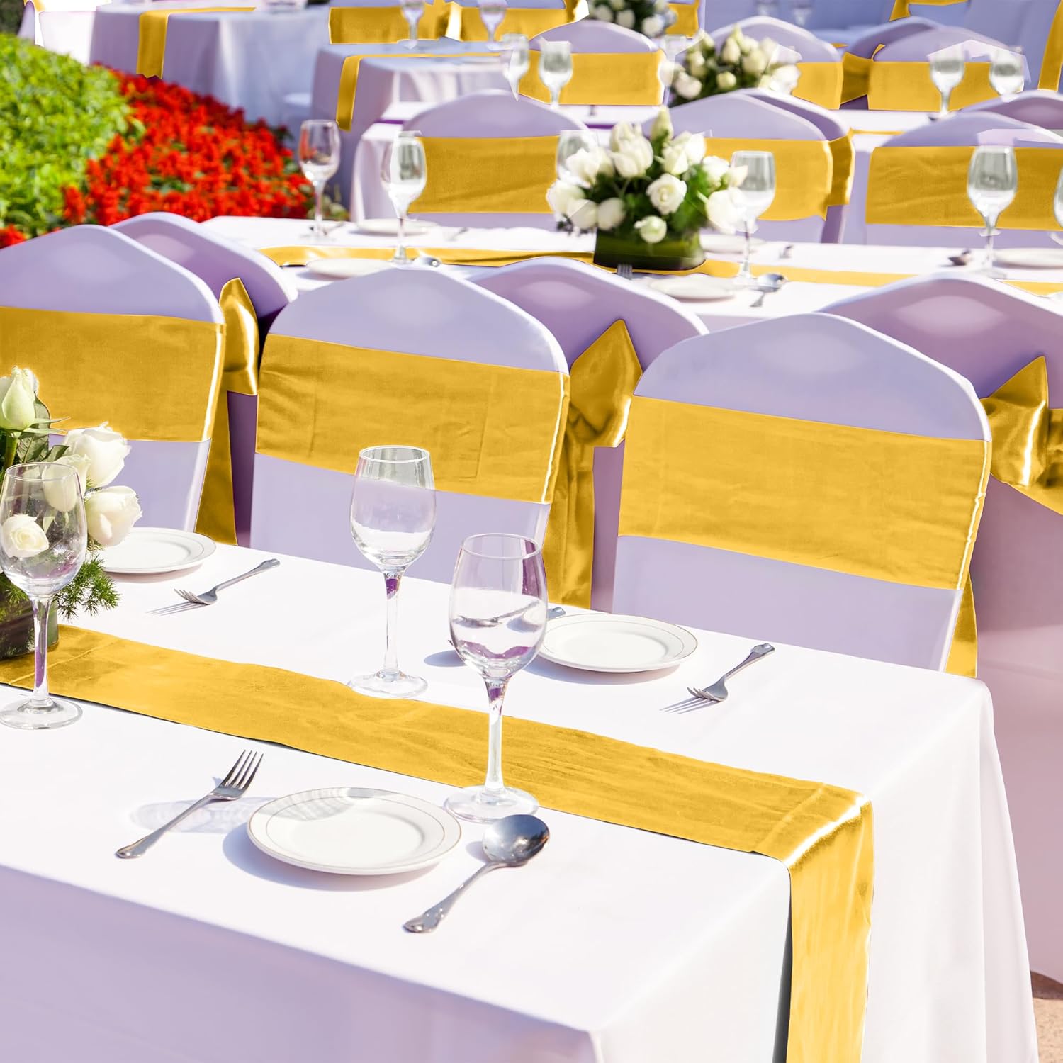 • Product size: each table runner is approximately 12 x 108 inches / 30 x 275 cm, which is large enough to cover rectangles and round tables, can also be spliced together for long tables; you can tie a bow to make the gold runner look more special, it can also be used as an ornament for chair covers