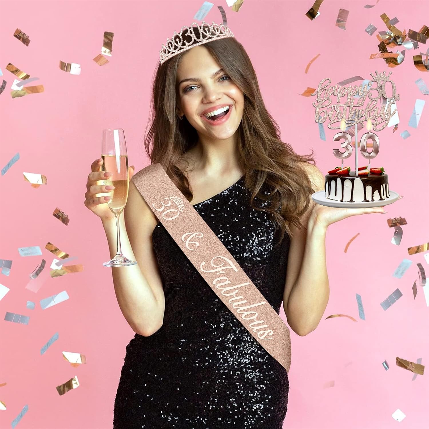 30th Birthday Decorations for Her, Including Sash, Crown/Tiara, Candles, Cake Topper, 30th Birthday Gifts for Her