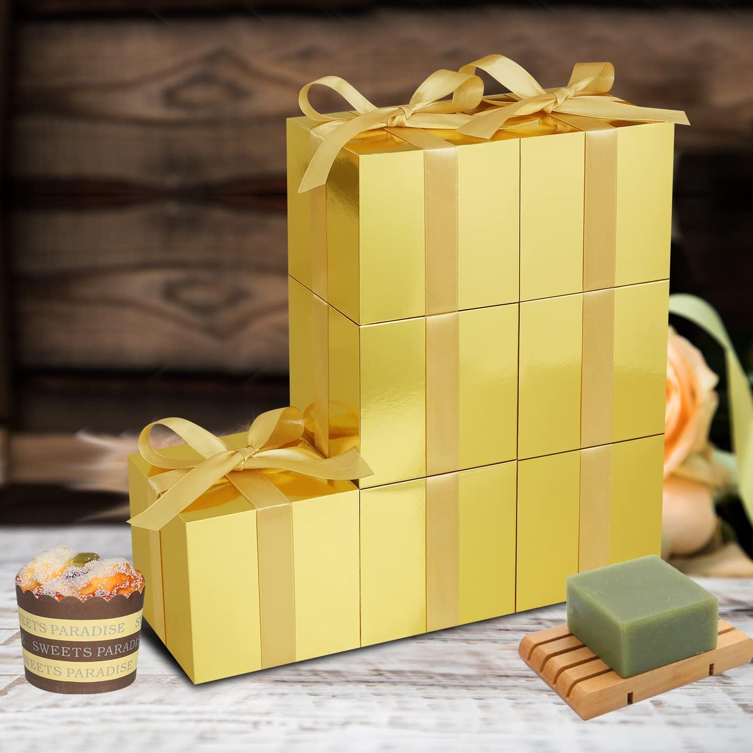 • Size Information: Wedding favor boxes size is 5x5x5 inch Inches, It is already equipped with ribbon and blank tag to complete the outside classy gift looks. Gold favor boxes are applicable to store candies, chocolates, cookies, cupcake, mugs, shot glasses, candles, bath bombs, soaps, perfumes, makeup, jewelry, or other small gift.