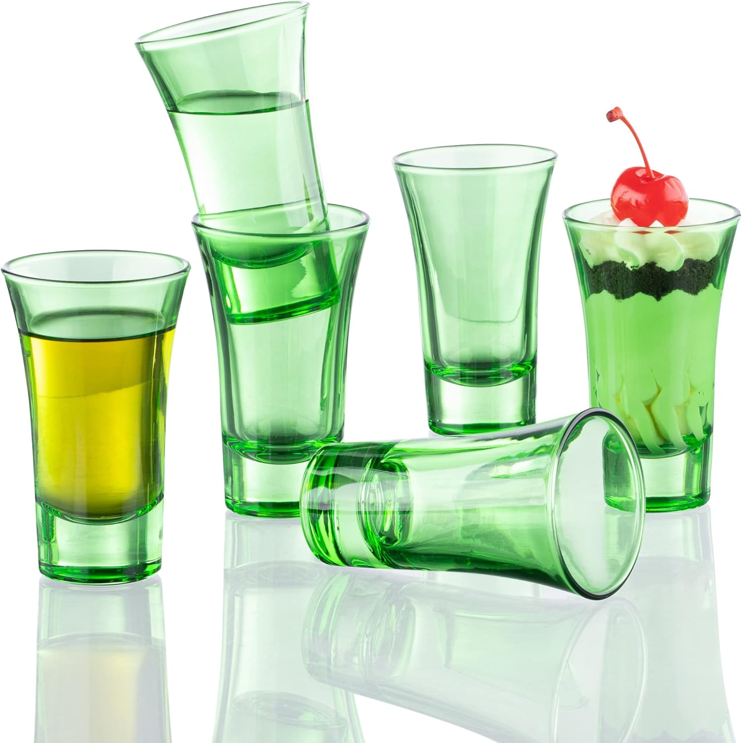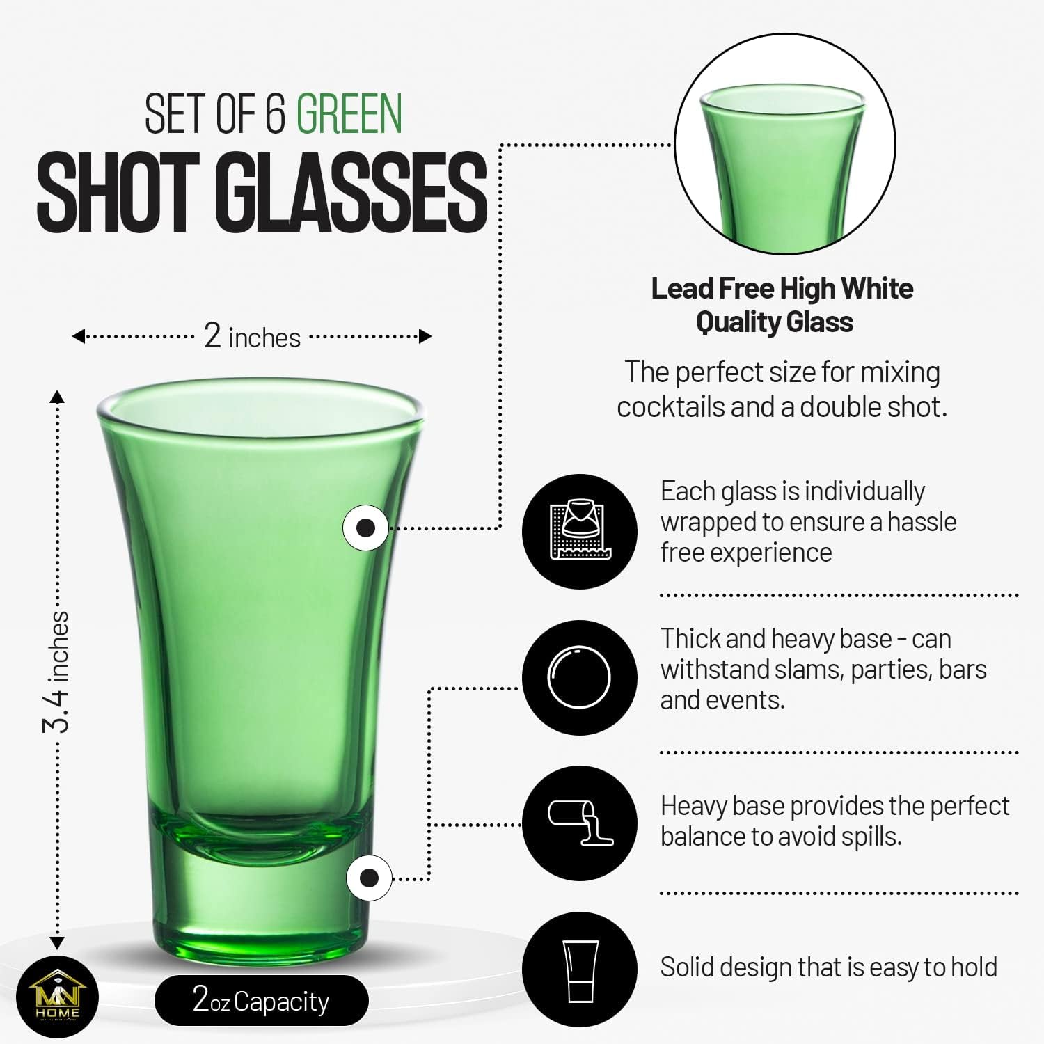 • Green Shot Glasses- Set of 6 fully colored green shot glasses. 2 Oz capacity shot glass, the perfect size for mixing cocktailsand a double shot. 3.4" High x 2" Diameter. Solid seamless design that is easy to hold and drink from. Each glass is individually wrapped to ensure a hassle free experience.