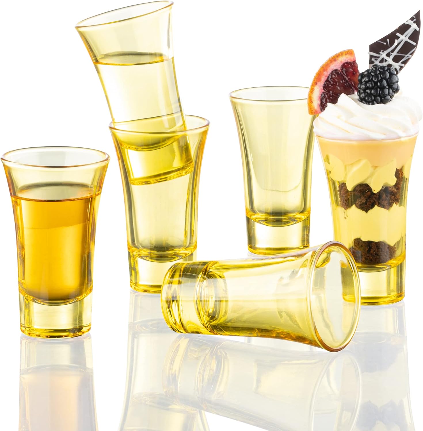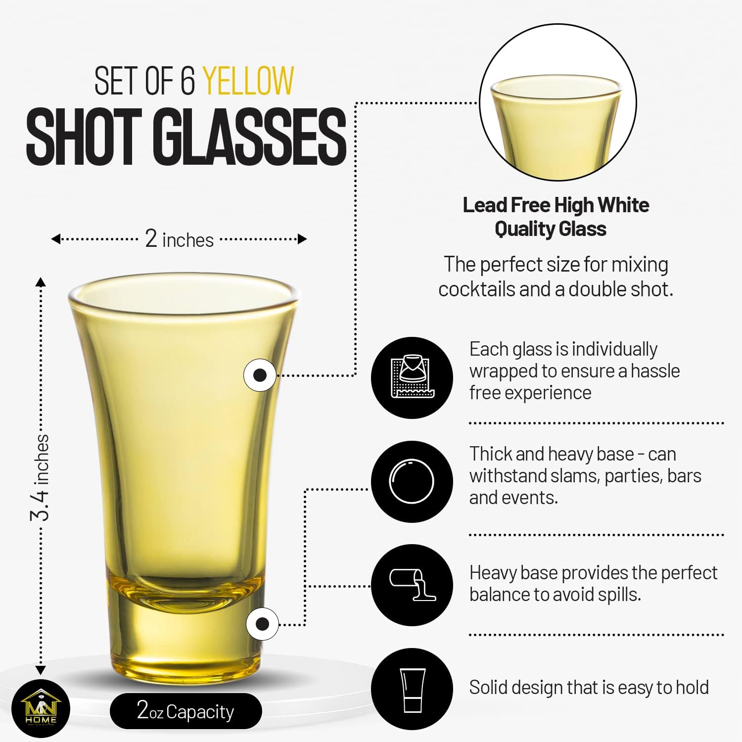 • Yellow Shot Glasses- Set of 6 fully colored yellow shot glasses. 2 Oz capacity shot glass, the perfect size for mixing cocktailsand a double shot. 3.4" High x 2" Diameter. Solid seamless design that is easy to hold and drink from. Each glass is individually wrapped to ensure a hassle free experience.
