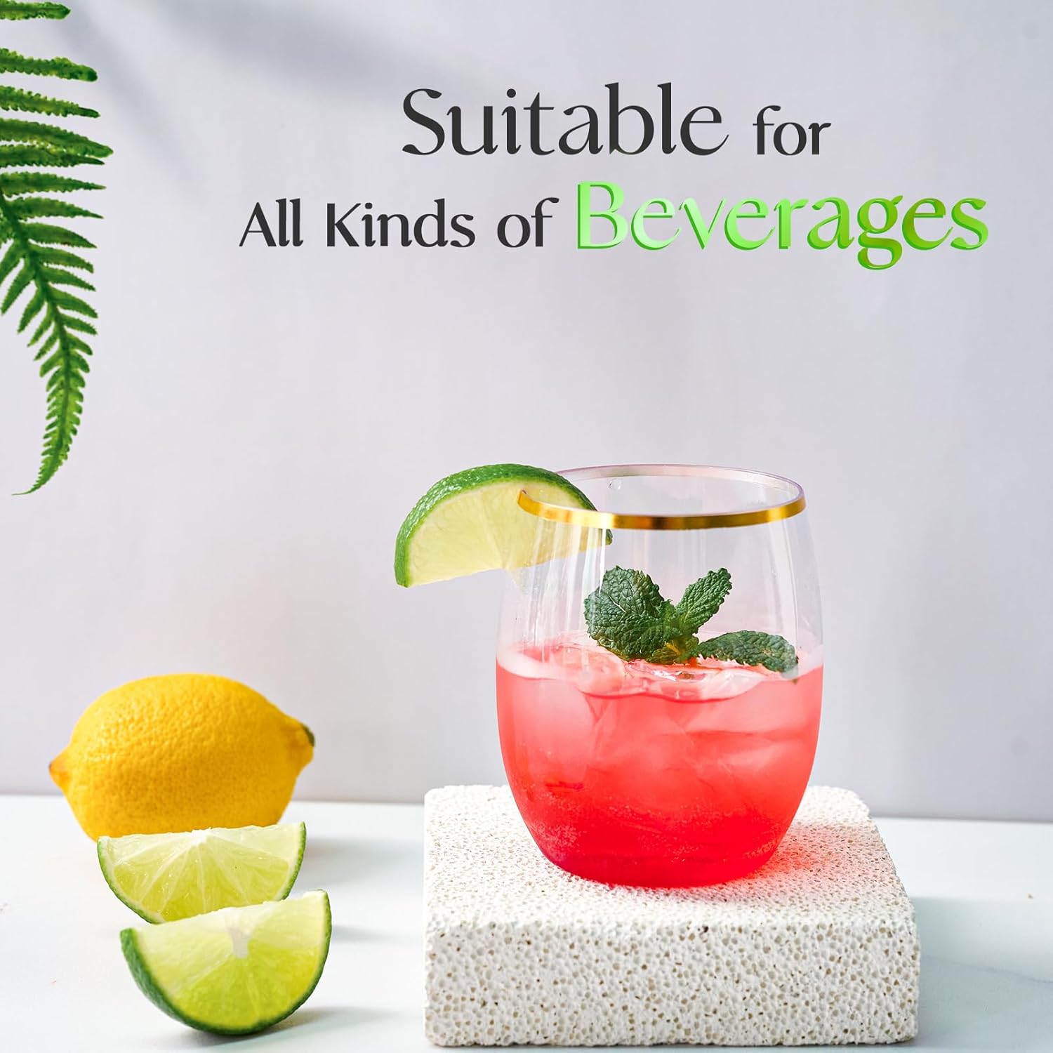 • Our gold rim stemless plastic wine glasses are heavy duty, unbreakable, shatterproof, disposable and reusable; High quality PET plastic makes the wine glass look crystal clear and adds a touch of ambiance to your party