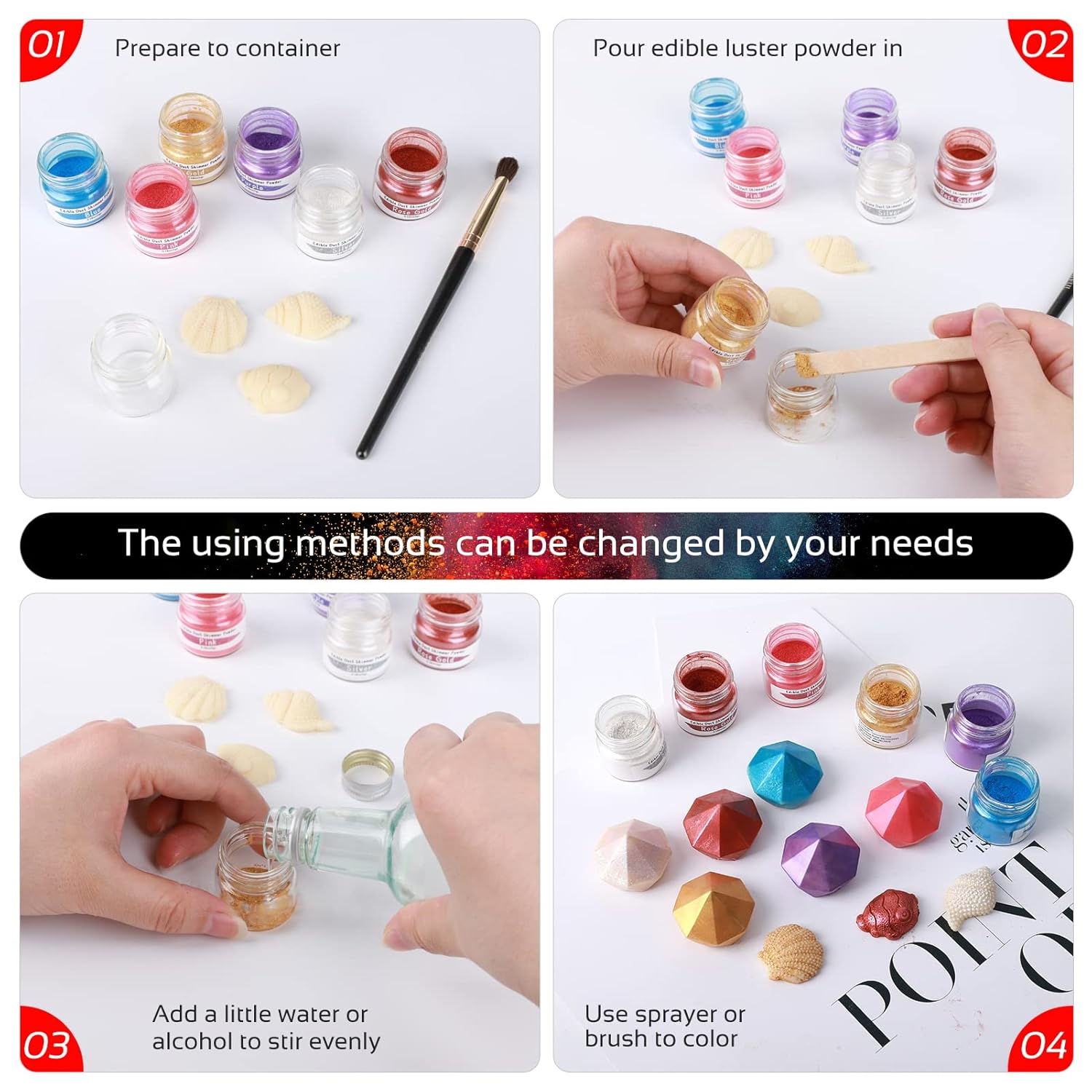 • 【Widely Used】Food-grade glossy cake decoration dust, shimmer luster powder is very suitable for chewing gum paste or fondant fudge, metal finish, fudge/chewing gum, chocolate, pull candy/isomaltose, drinks, etc.,