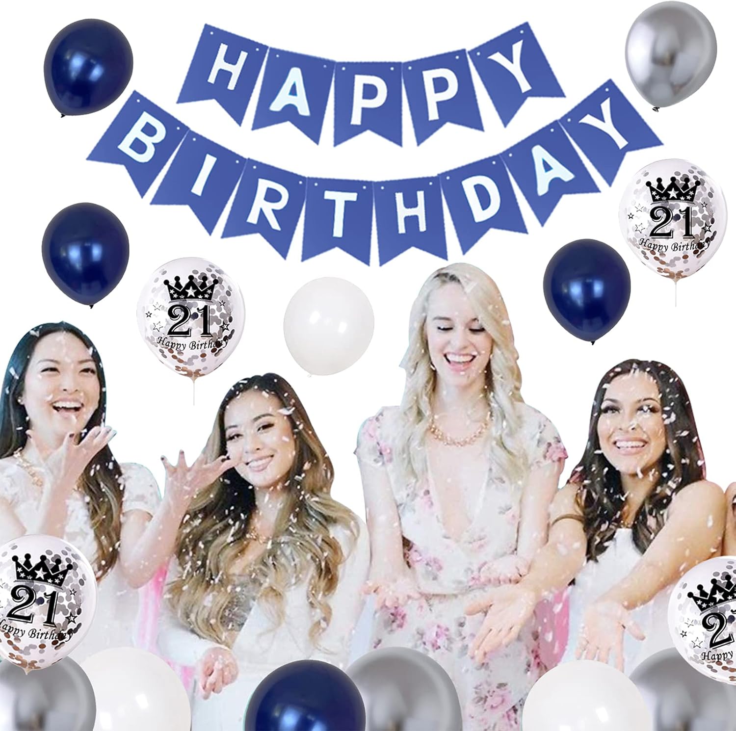 • 【21st Party Decoration Included】Dark blue "HAPPY BIRTHDAY" Banner, 32 inch Number 21, 6x12-inch metallic silver balloons, 6x12-inch matte white balloons, 15x12-inch deep sea blue balloons, 6x12-inch printed silver sequins balloons, 2x18-inch silver pentagrams balloons, 1x dot glue and straw,10M ribbon.