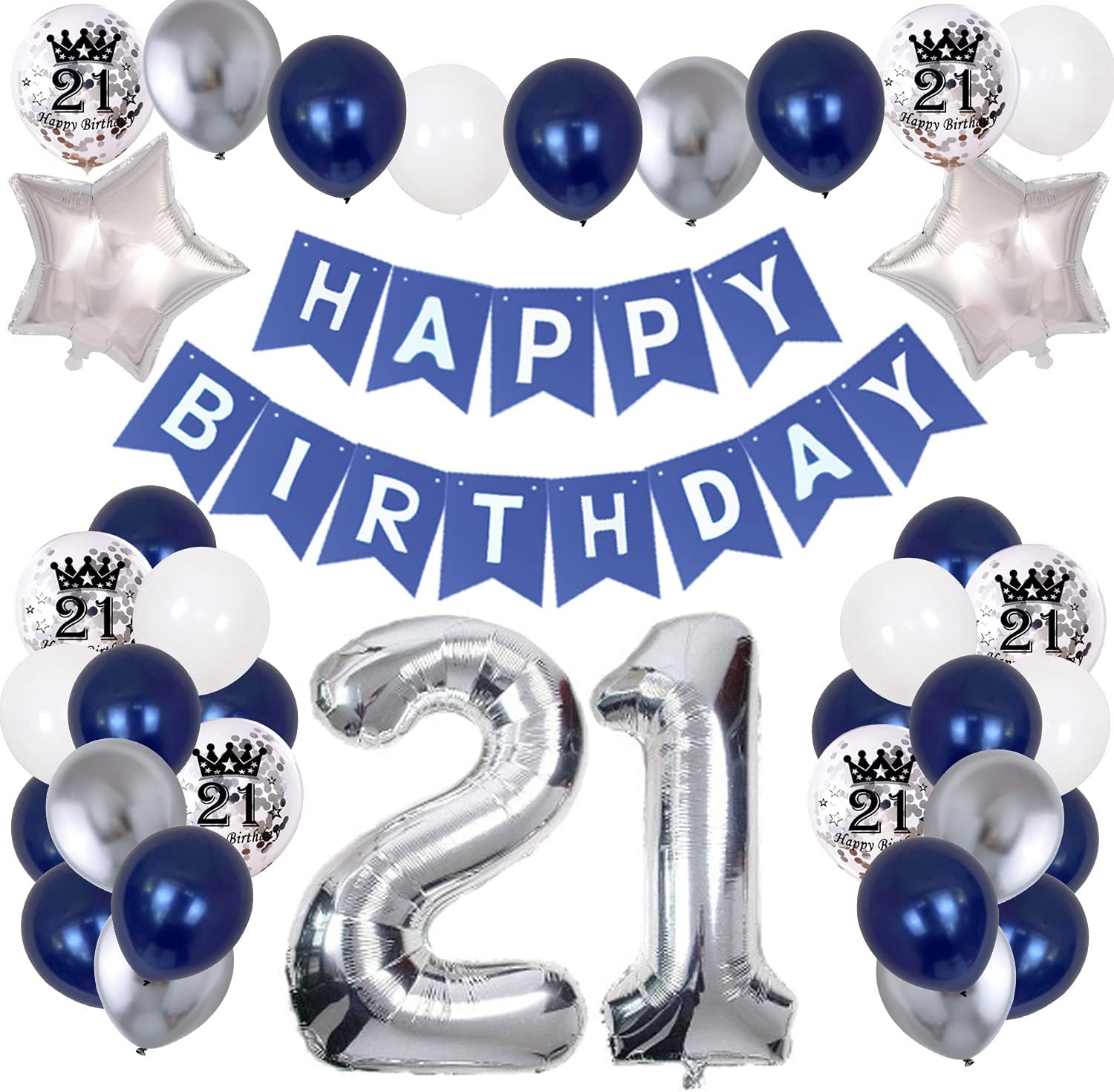 21st Birthday Decorations for Men - Happy Birthday Banner, Foil Number 21 Balloons, Silver Navy Blue Theme Party Supplies