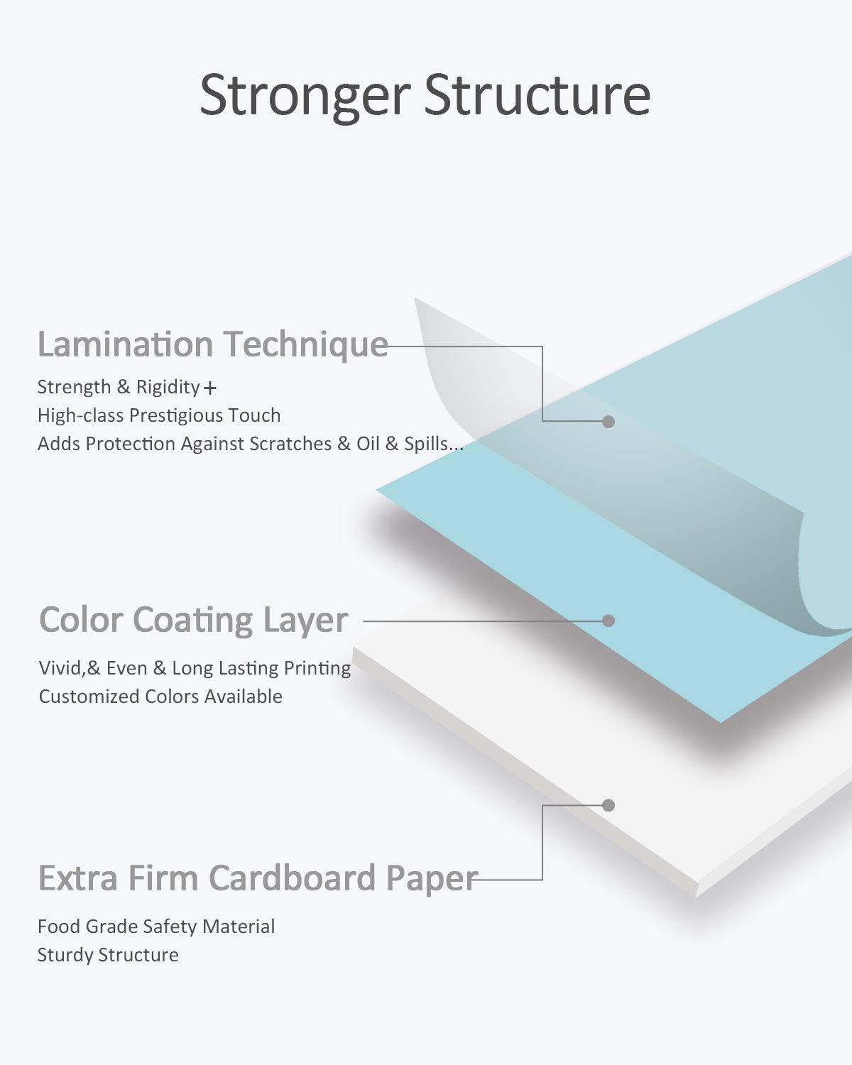 • High Quality:We adopt superior raw material only,and our box quality through the food safty quality text(FDA).Most of the paperboard after printing that you will find inferior Material will give a unhealthy smell, and it will fade after quick friction,Especially pink and black. Our paper was crafted from sustainably sourced, FSC-certified forest, (FSC-C215221) ensuring an eco-friendly choice for your home .