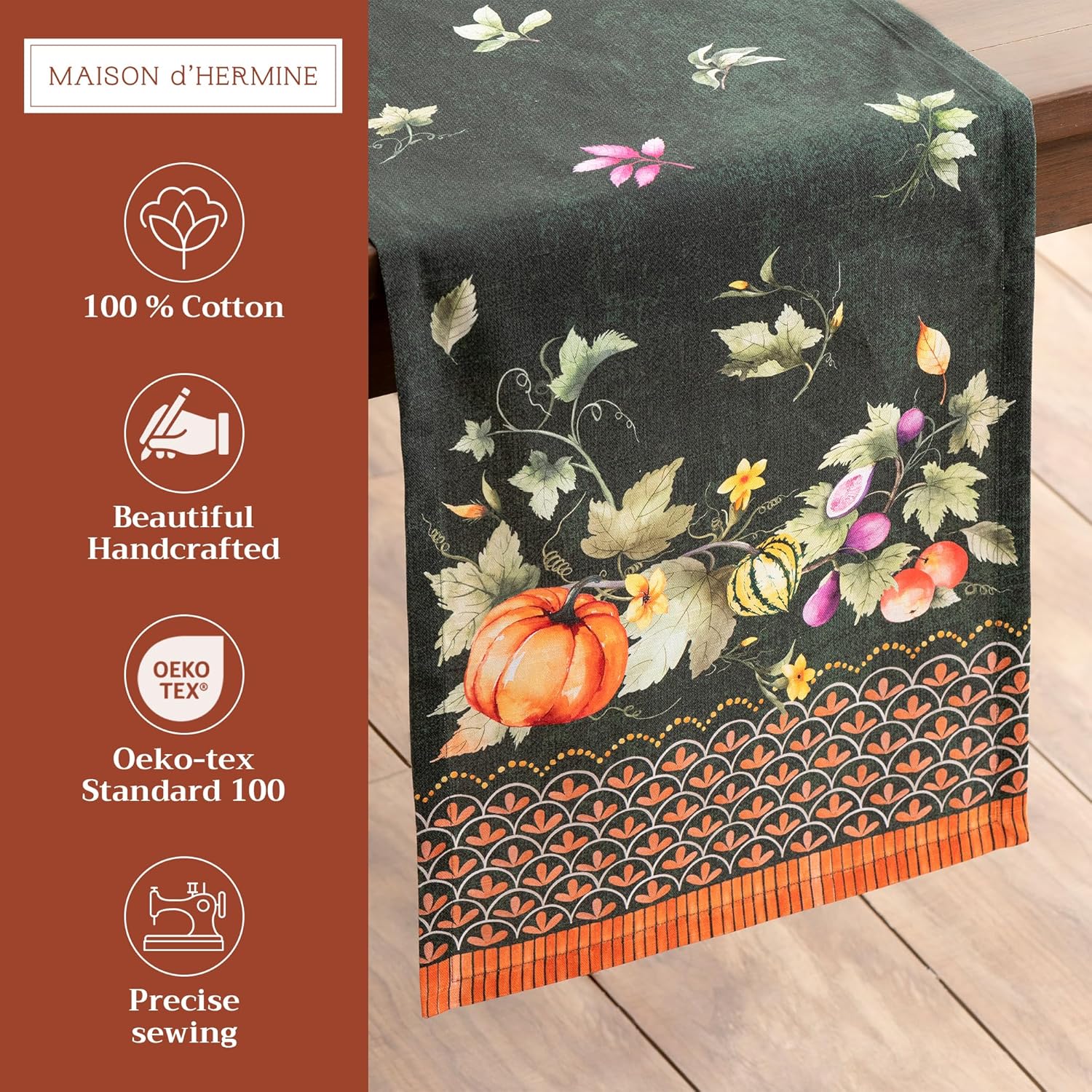 Maison d' Hermine Table Runner 100% Cotton Single Layer Table Runners 108 inches Long for Thanksgiving Christmas Decorations Home Kitchen Dining Wedding (Pumpkin Garden - Dark Green, 14.5" x 108")