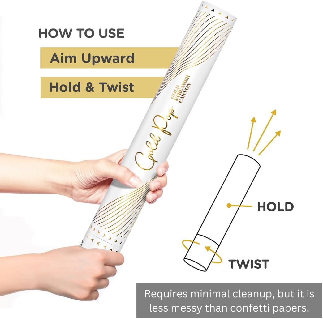 • πŸŽ‰ EASY POINT & TWIST ACTION - Don't need the strongest arms to blow up these babies! Point upwards away from people and twist to shoot, GOLD Streamer is loaded on top of compressed air and is launched by twisting the cannon. Operation manual is included inside the box.
