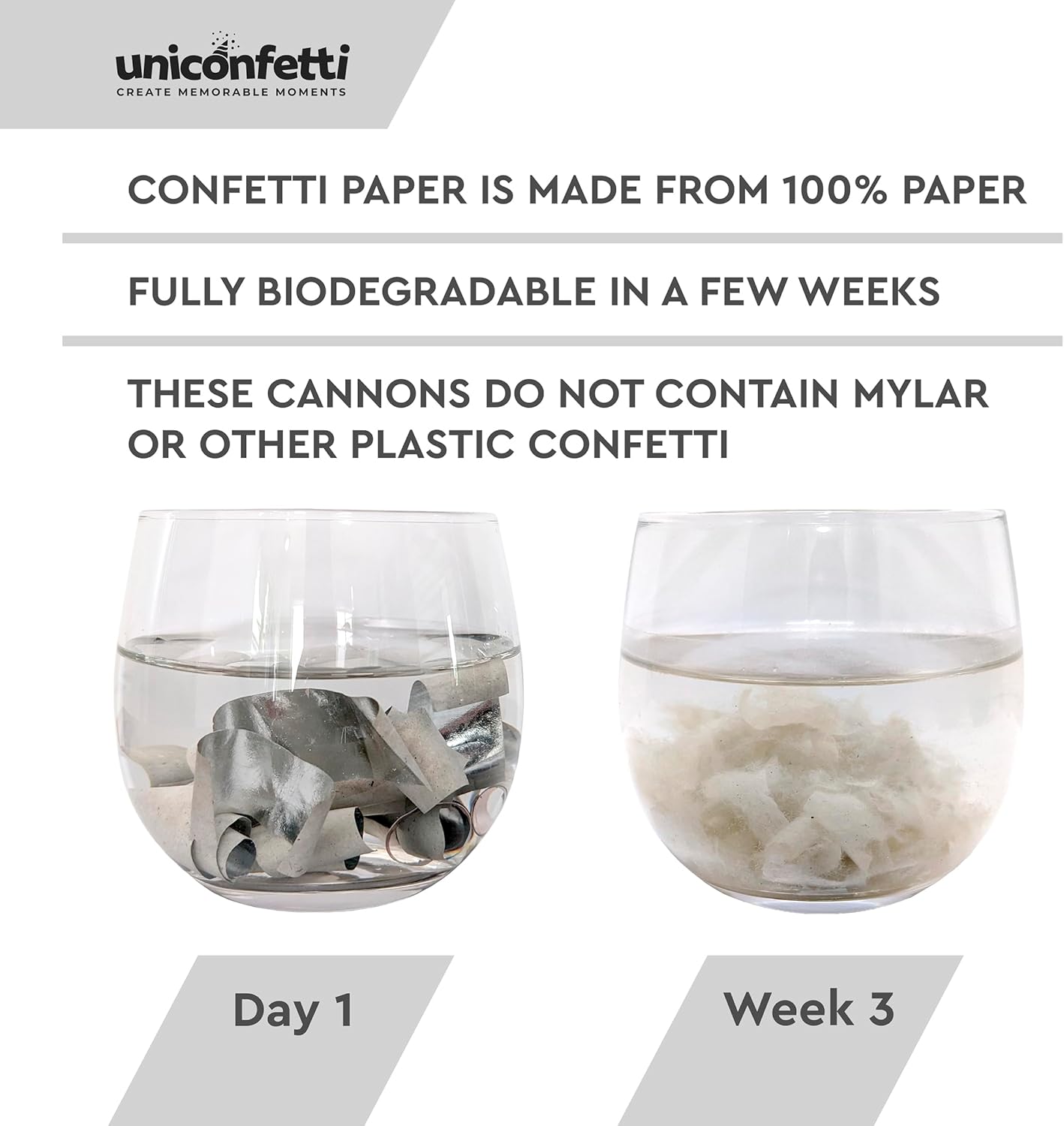 • πŸŽ‰ EASY POINT & TWIST ACTION - Don't need the strongest arms to blow up these babies! Point upwards away from people and twist to shoot, Biodegradable Silver confetti paper is loaded on top of compressed air and is launched by twisting the cannon. Operation manual is included inside the box.