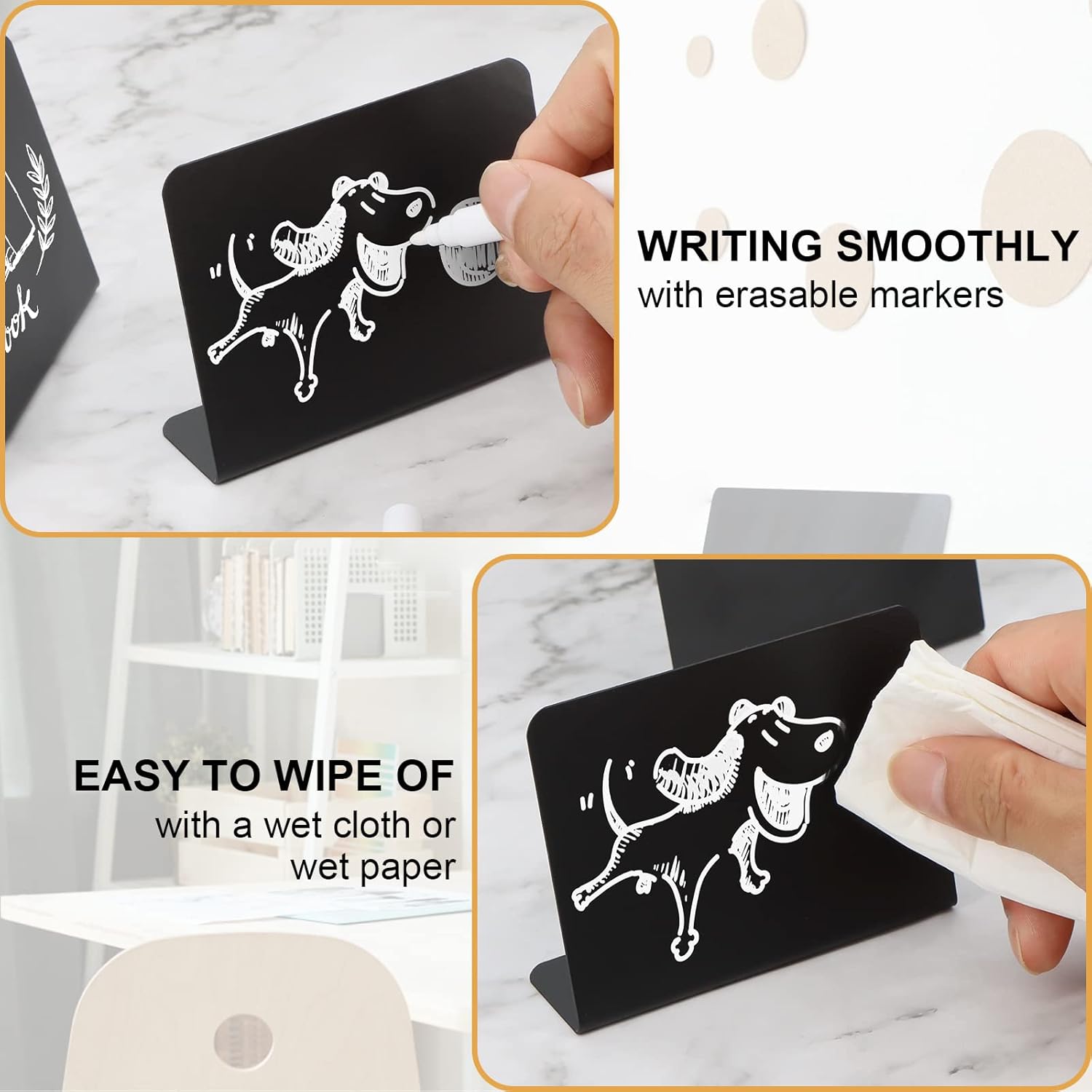• QUICK DRYING -- Mini blackboard signs provide a smooth writing experience, you can write any character on it and even draw freely, let your unique ideas form a beautiful landscape on your desktop. Party food labels dry quickly without getting hands dirty.