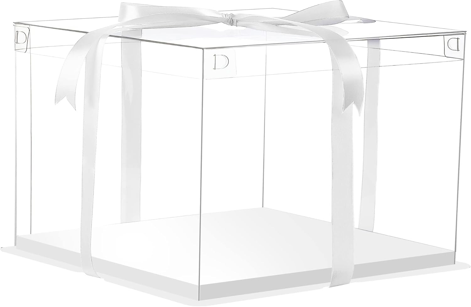• 【Size and material】-The product includes 6 transparent cake boxes with A roll of white ribbon. Box size: 12"x12"x7", suitable for 10inch or 12inch cakes and gift packaging. Made of cardboard and PET materials, safe and durable. The top and middle part of the cake box are transparent, and the cake box bottom tray is white
