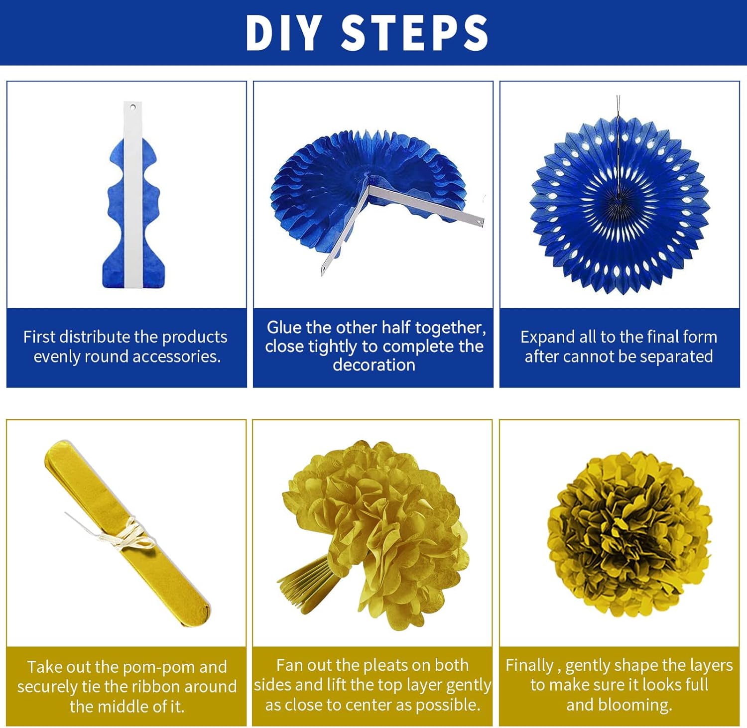 • Easy To Assemble: Pom poms need you to spend a few minutes peeling apart and letting them become fluffy, then unfold and slot the lanterns and honeycomb balls into place, unroll garlands gently to avoid tangling, finally hang them to decorate your party. Moreover, they are reusable, just folding them for store if you want to reuse them.