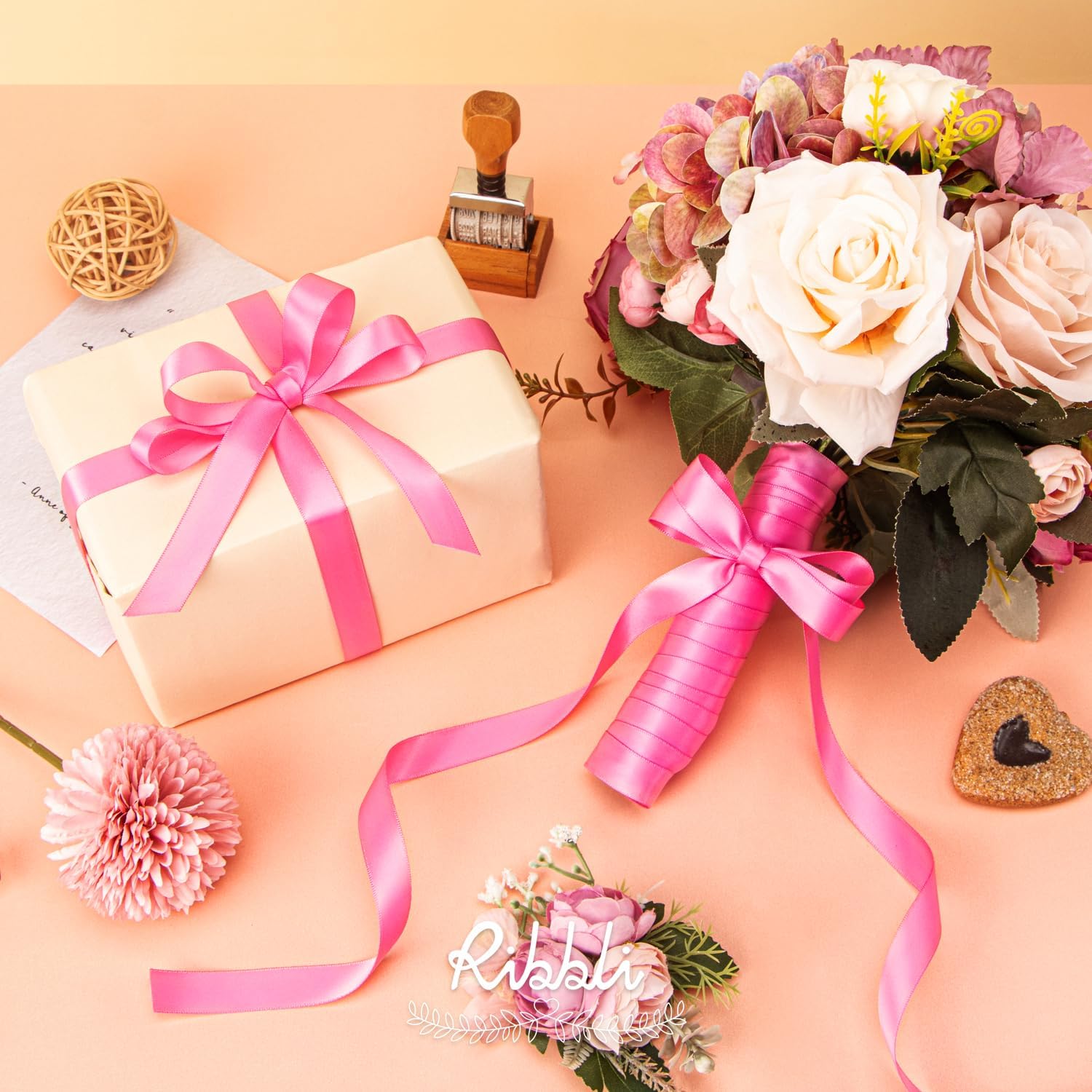 Ribbli Hot Pink Satin Ribbon 5/8 inch x Continuous 25 Yards,Double Faced Satin Use for Craft, Gift Wrapping, Christmas Ornaments, Hair Bows, Bouquet Bows