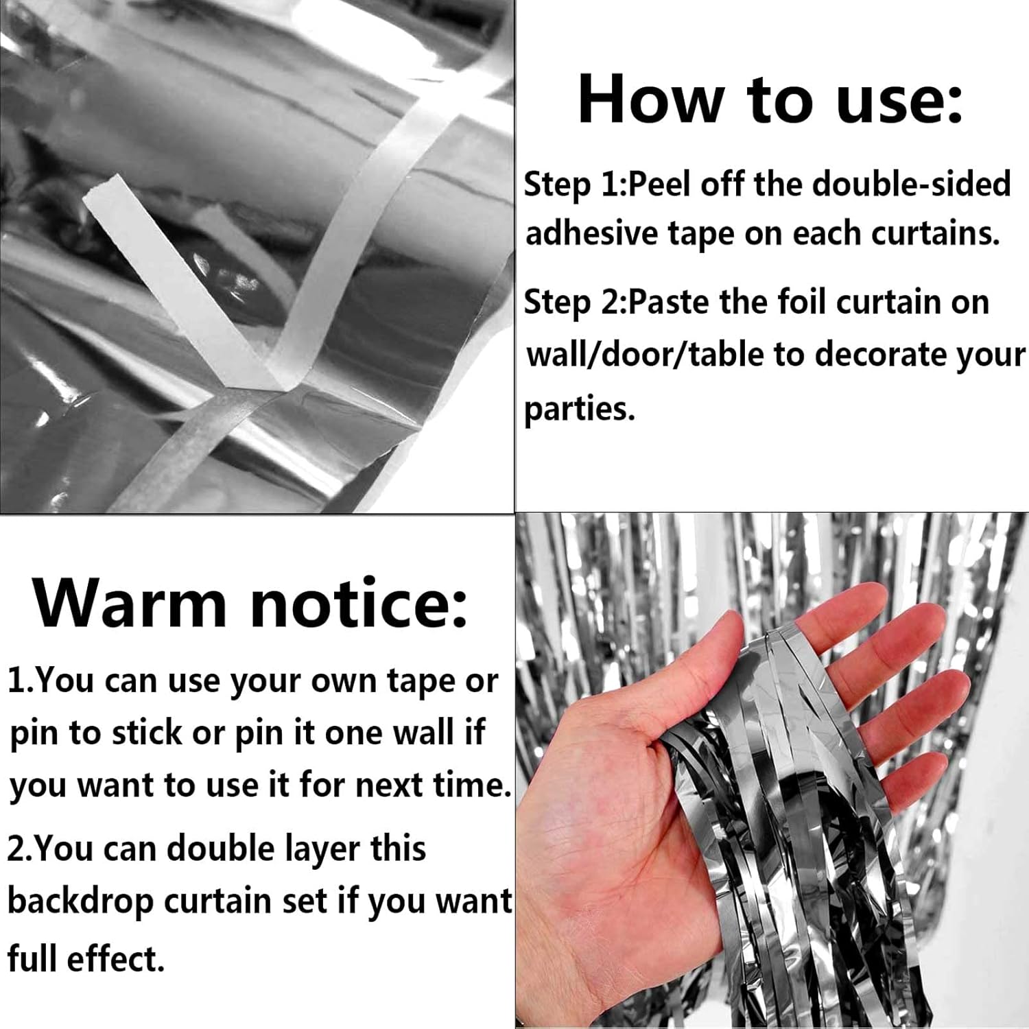 • The foil curtains good for party backdrop curtain, place on a wall and serves as a background for photos of any celebrations like: birthday party, theme party, Halloween, Christmas, New Year Eve, bachelorette party, wedding, bridal shower, baby showers, graduations and more.