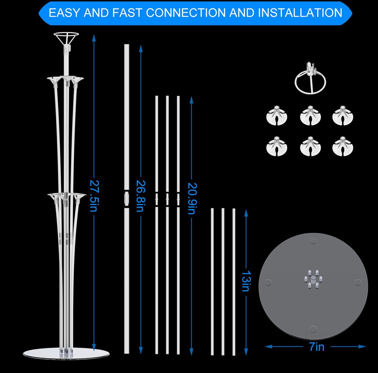 • Balloon Stand Size - Base diameter: 6.9 inches. Sticks: 1 x 28 inches long, 3 x 23.5inches long, 3 x 15.5inches long. The pole is made of durable transparent plastic and the base is made of acrylic. Can be reused.